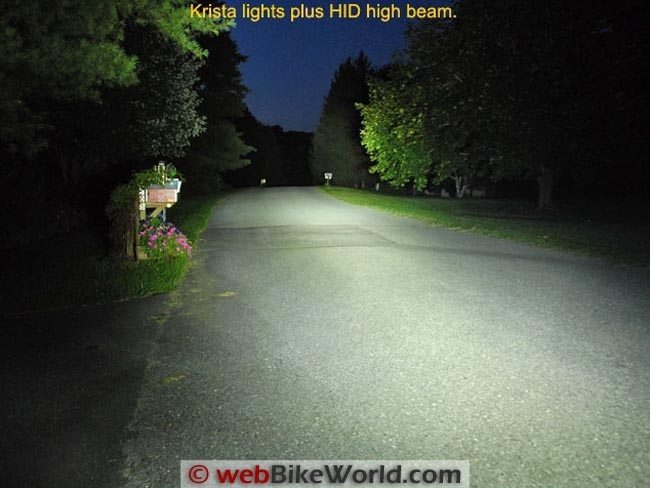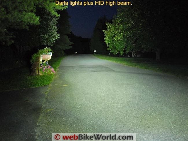 It’s not easy to take photos that truly represent the light output from motorcycle lights, but we try our best. These photos were taken at different times (i.e., the Darla and Krista photos were taken back when those lights were evaluated).