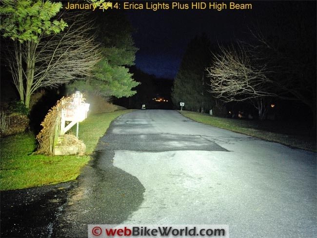 The amount of light easily overwhelms anything your wimpy headlight can throw and you could probably easily (albeit illegally) use one Erica light as a sole-source headlight on a custom bike and still have way more light than a stock headlight can manage.