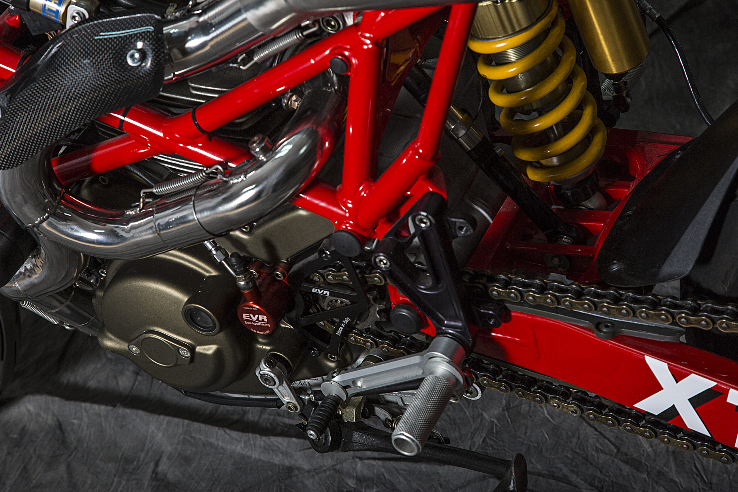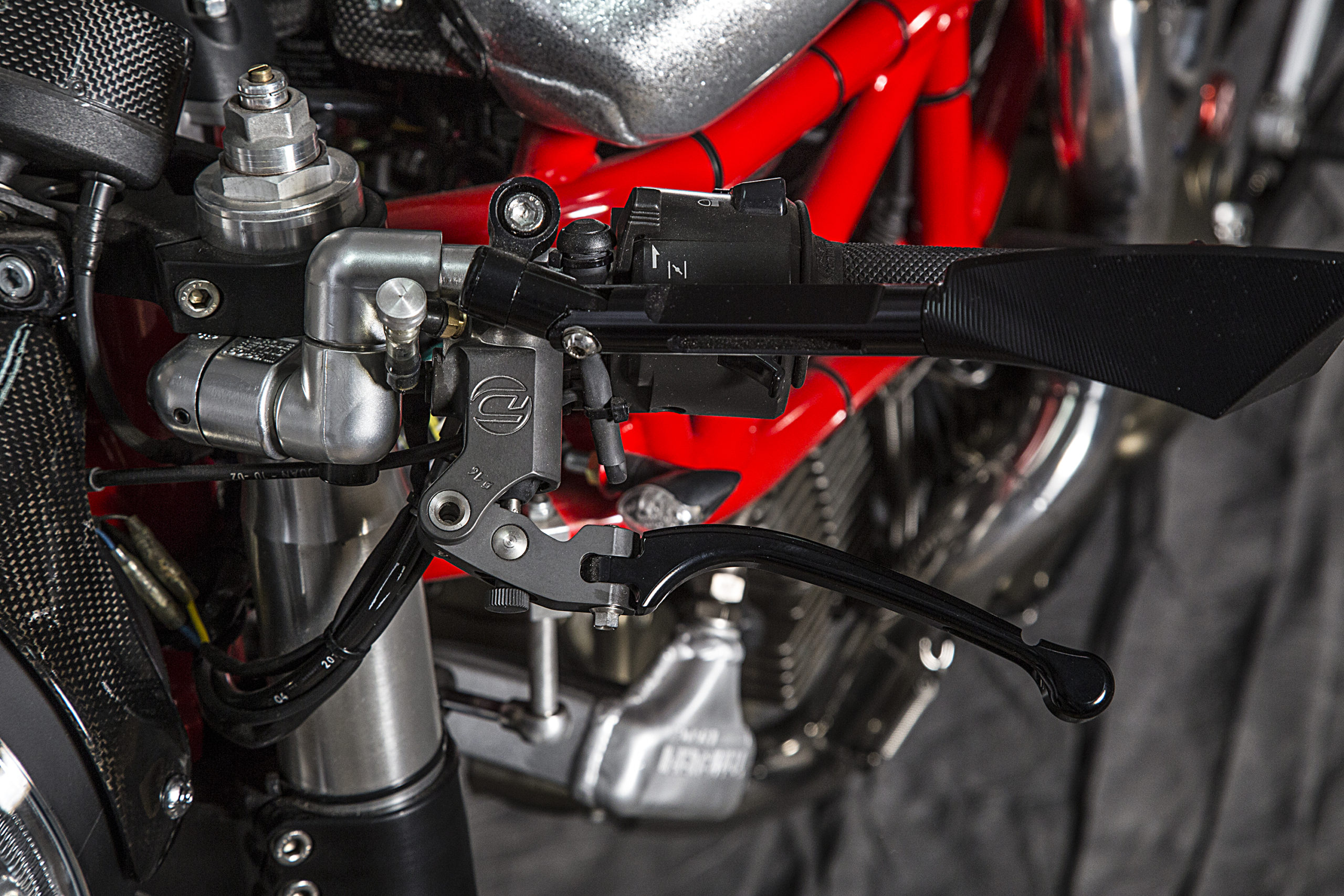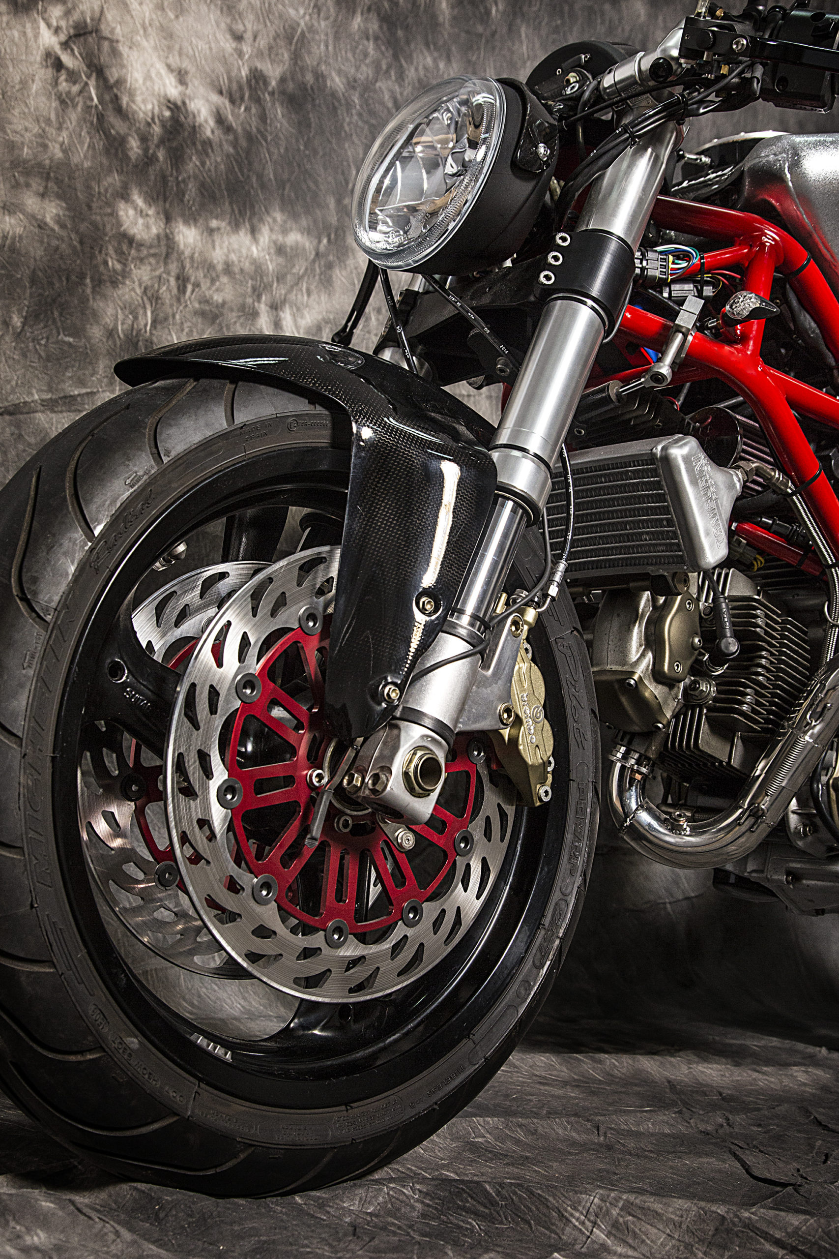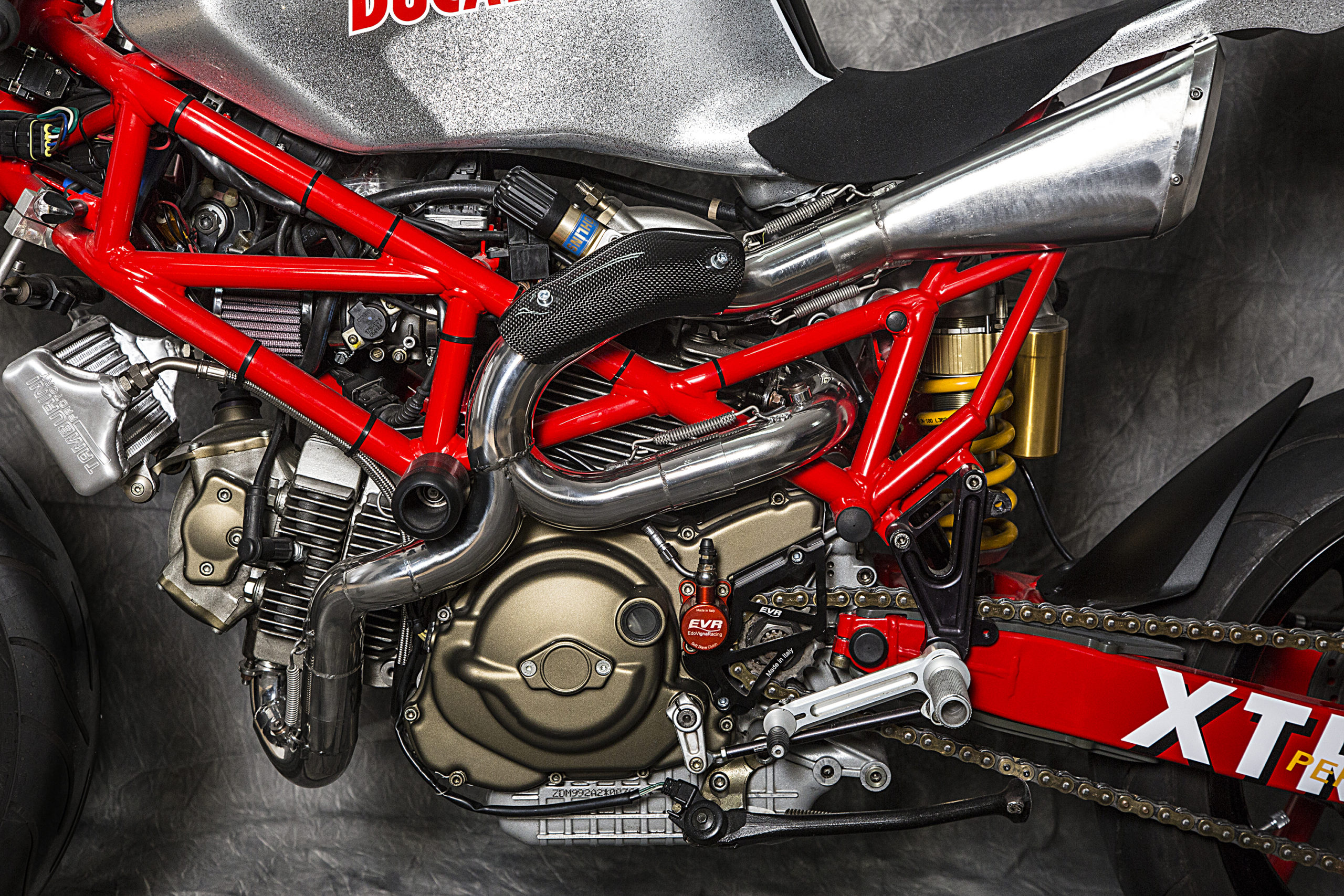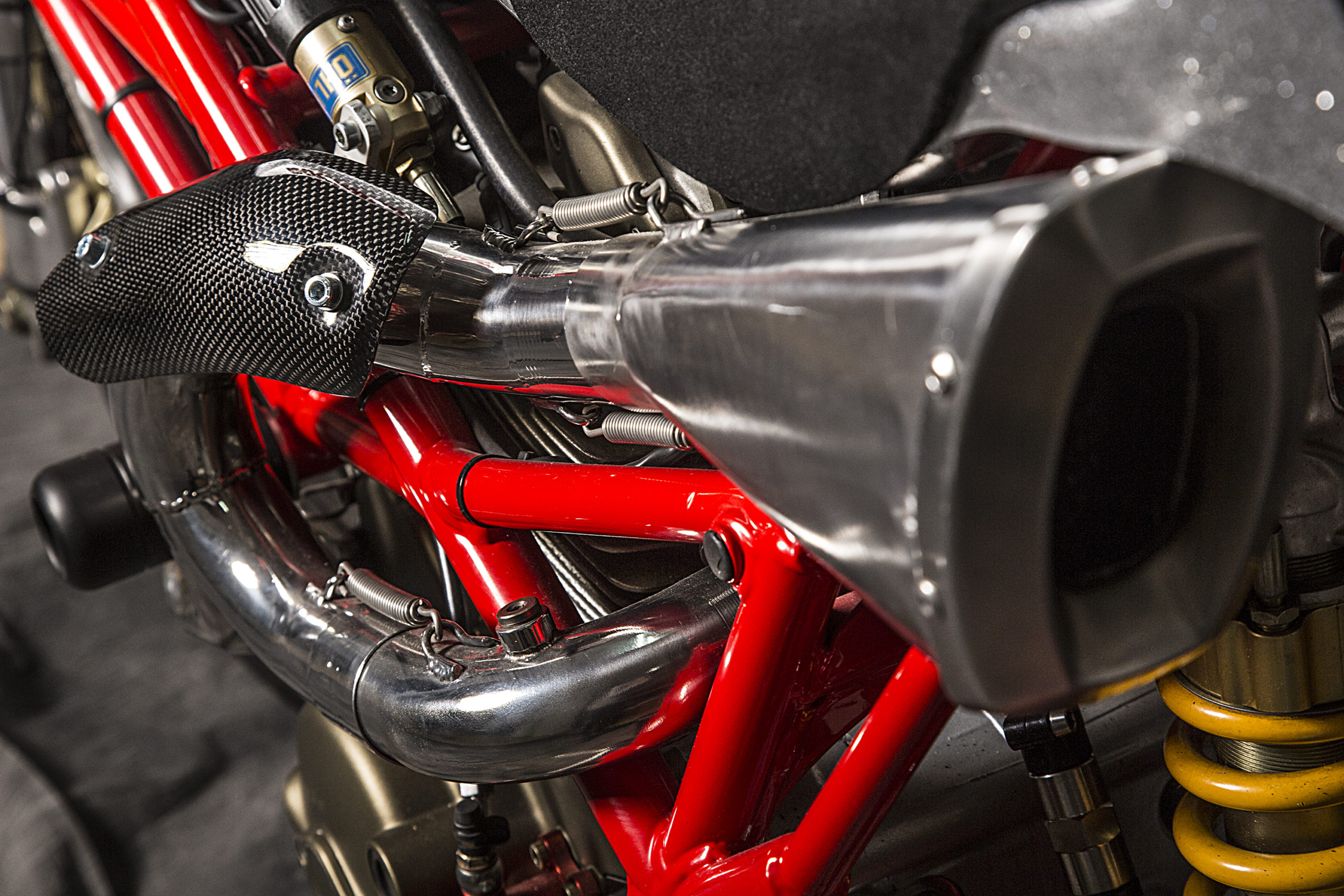 Other features of this beautiful hyper-naked build include a Regulable S2R 1000 fork, tweaked Ducati 749 gas tank (with an endurance quick filling gas cap), a RAD 02 solo seat and a Team Red performance steering damper matched to a SuperMario 2 in 1 exhaust system with megaphone to amplify the original 1000cc Dual Spark engine…just because.