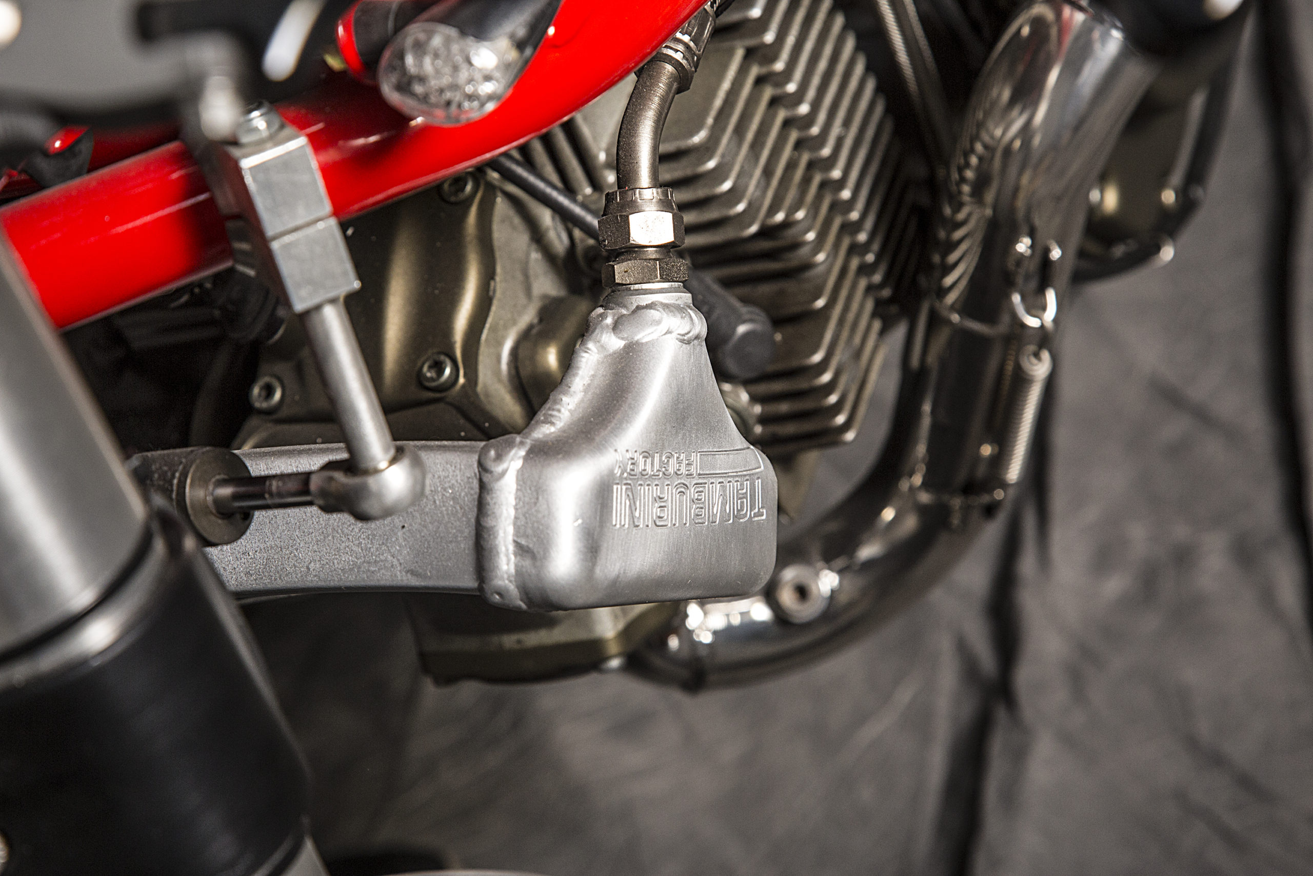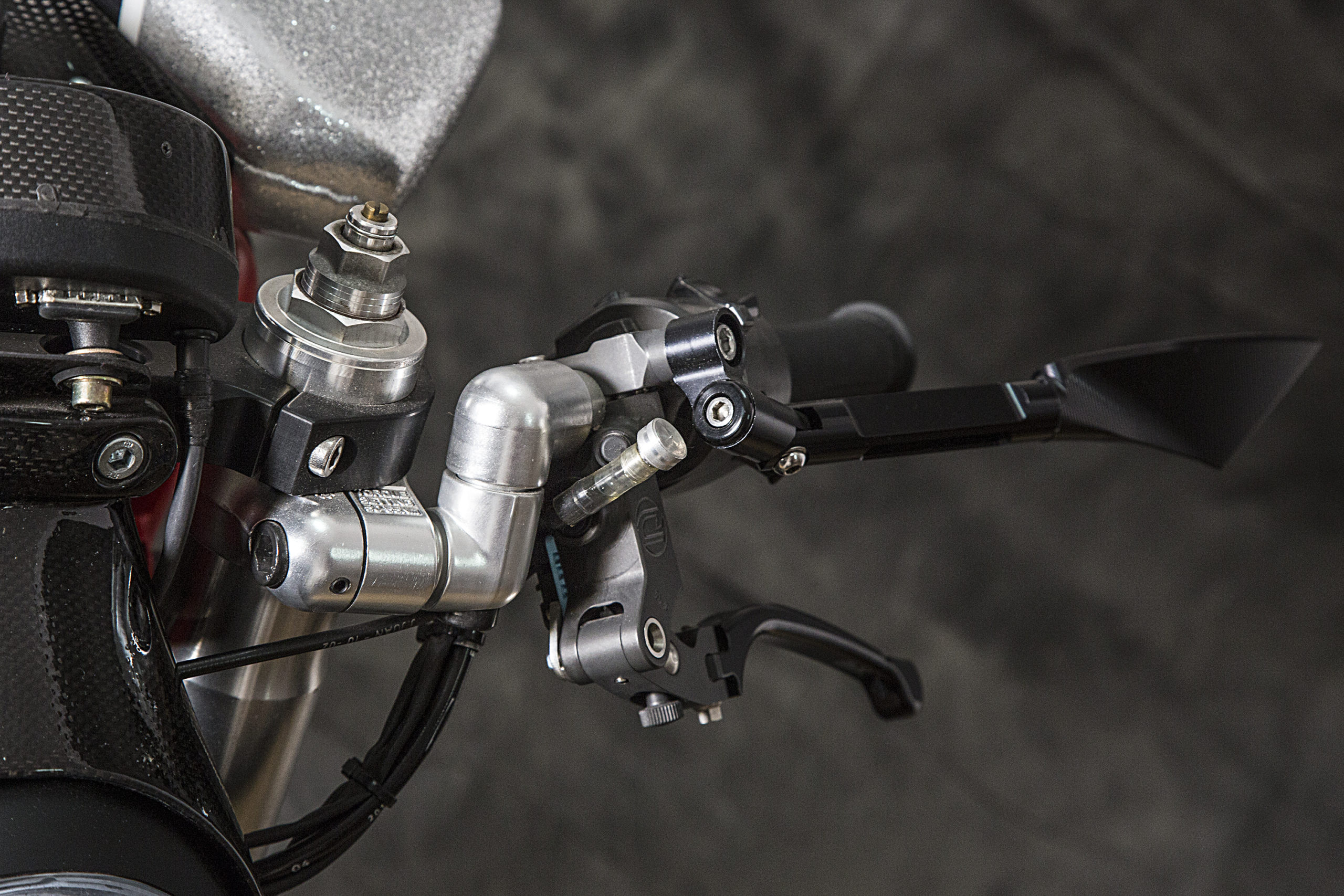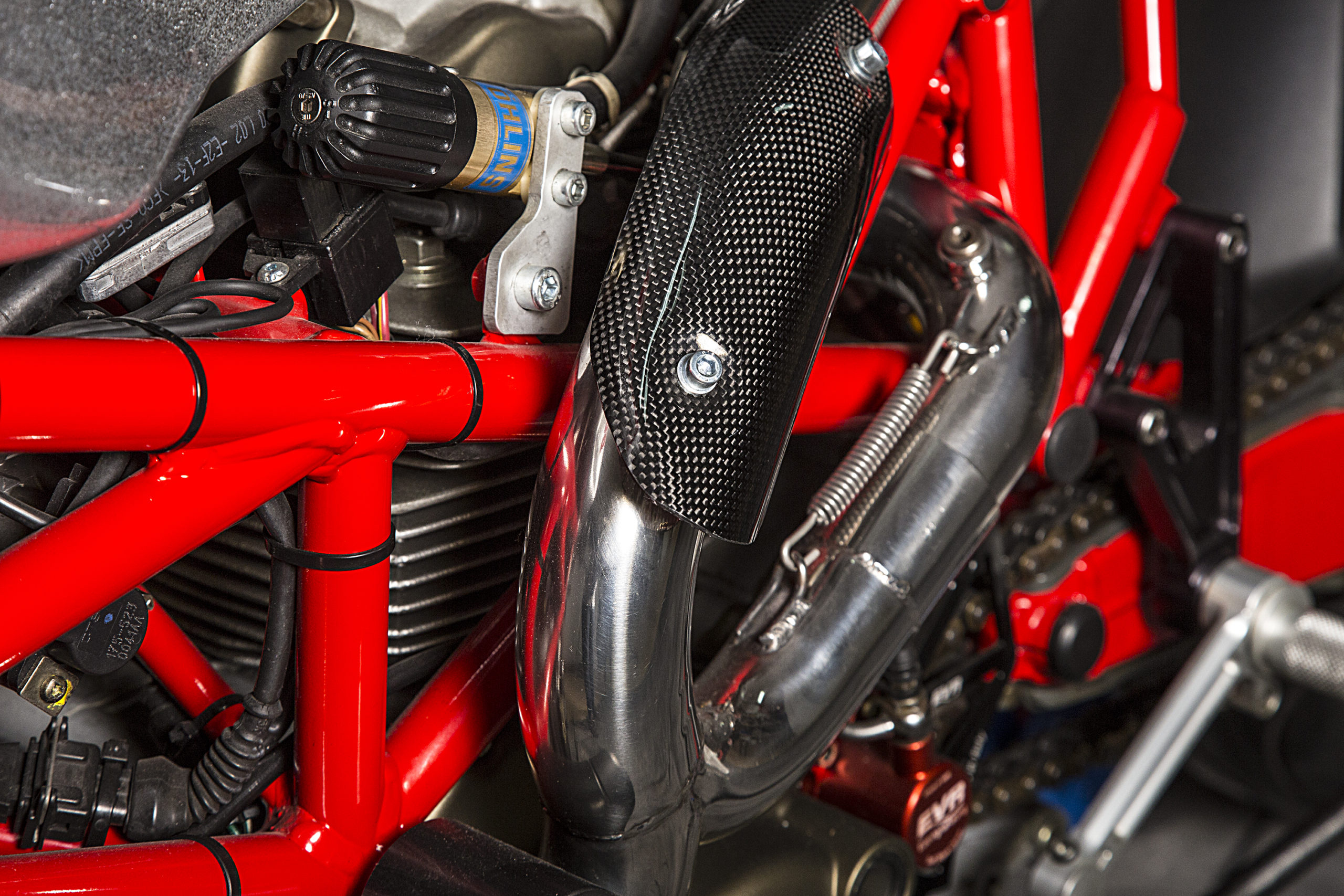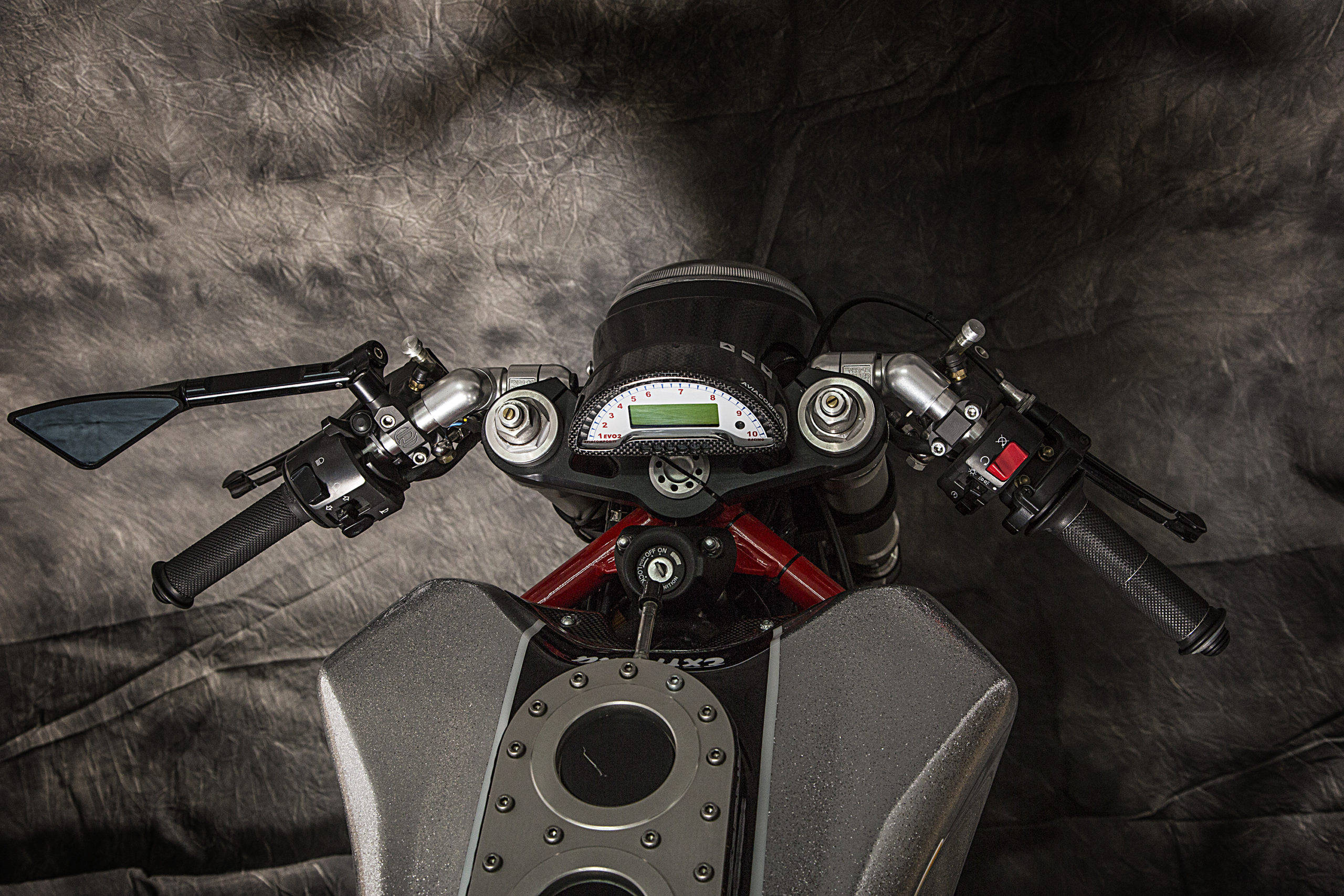 Other features of this beautiful hyper-naked build include a Regulable S2R 1000 fork, tweaked Ducati 749 gas tank (with an endurance quick filling gas cap), a RAD 02 solo seat and a Team Red performance steering damper matched to a SuperMario 2 in 1 exhaust system with megaphone to amplify the original 1000cc Dual Spark engine…just because.