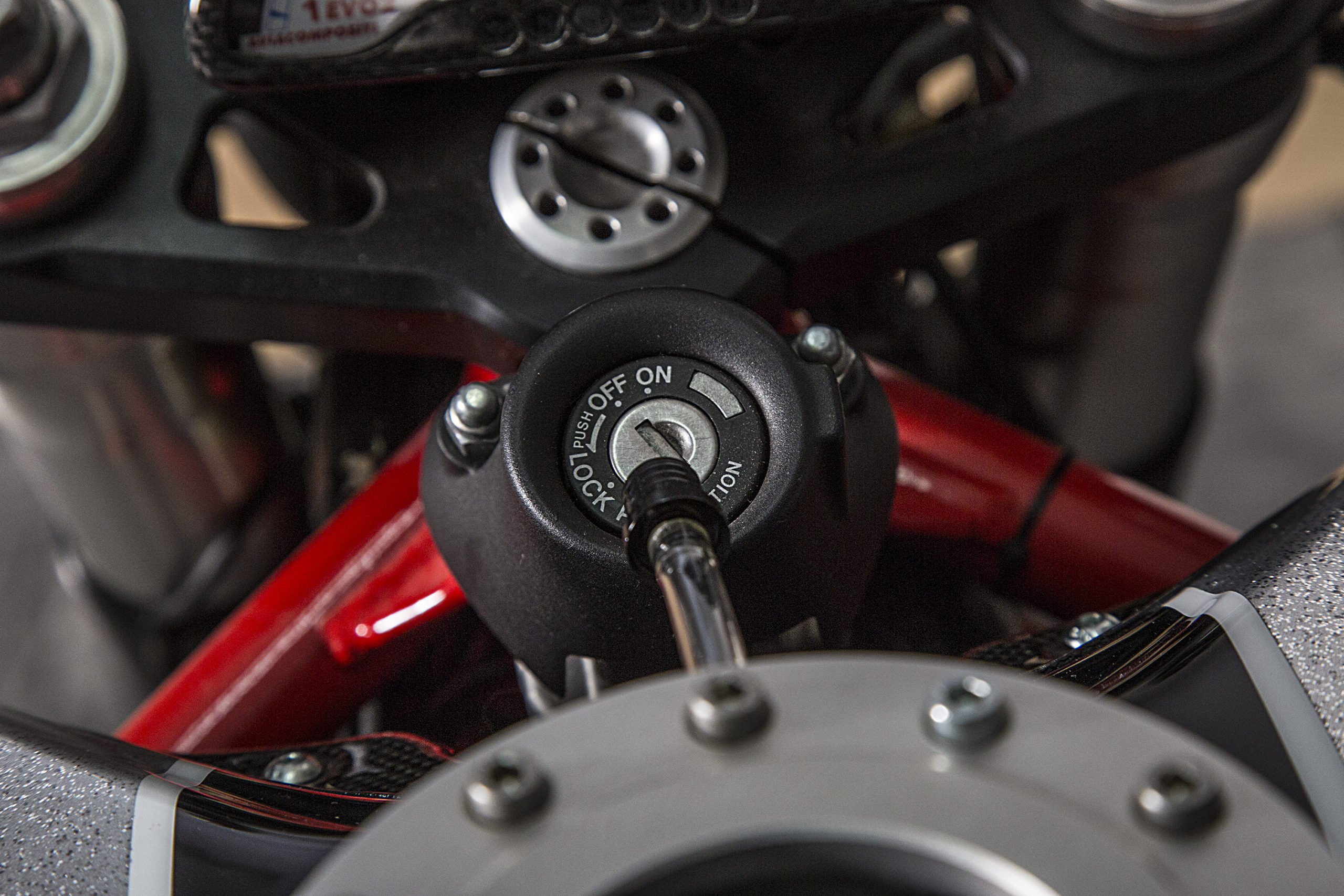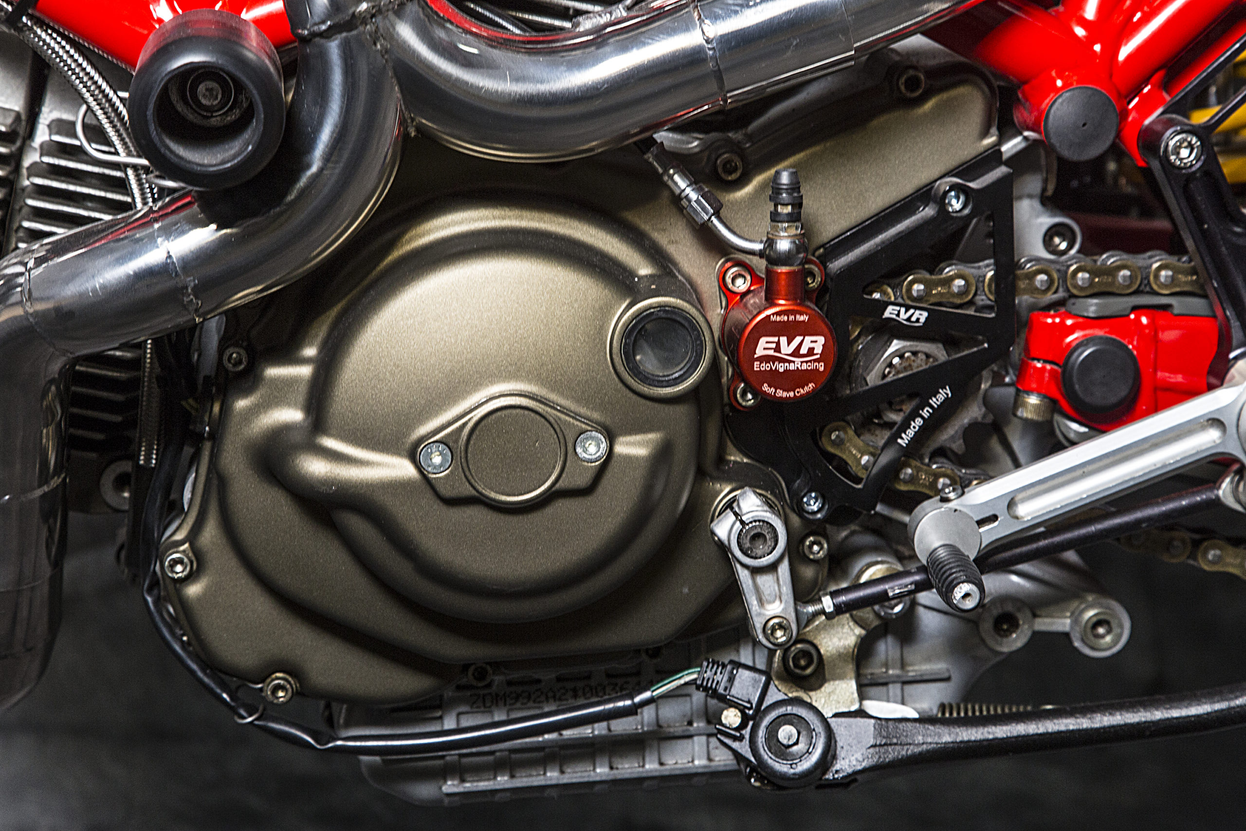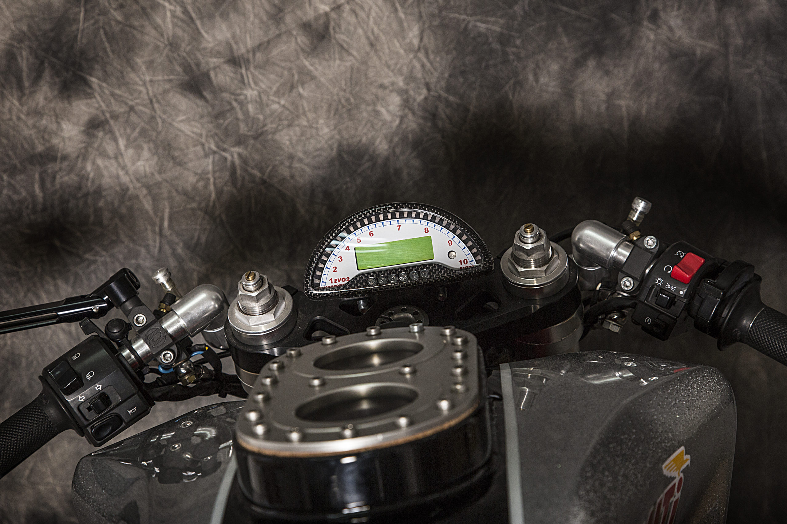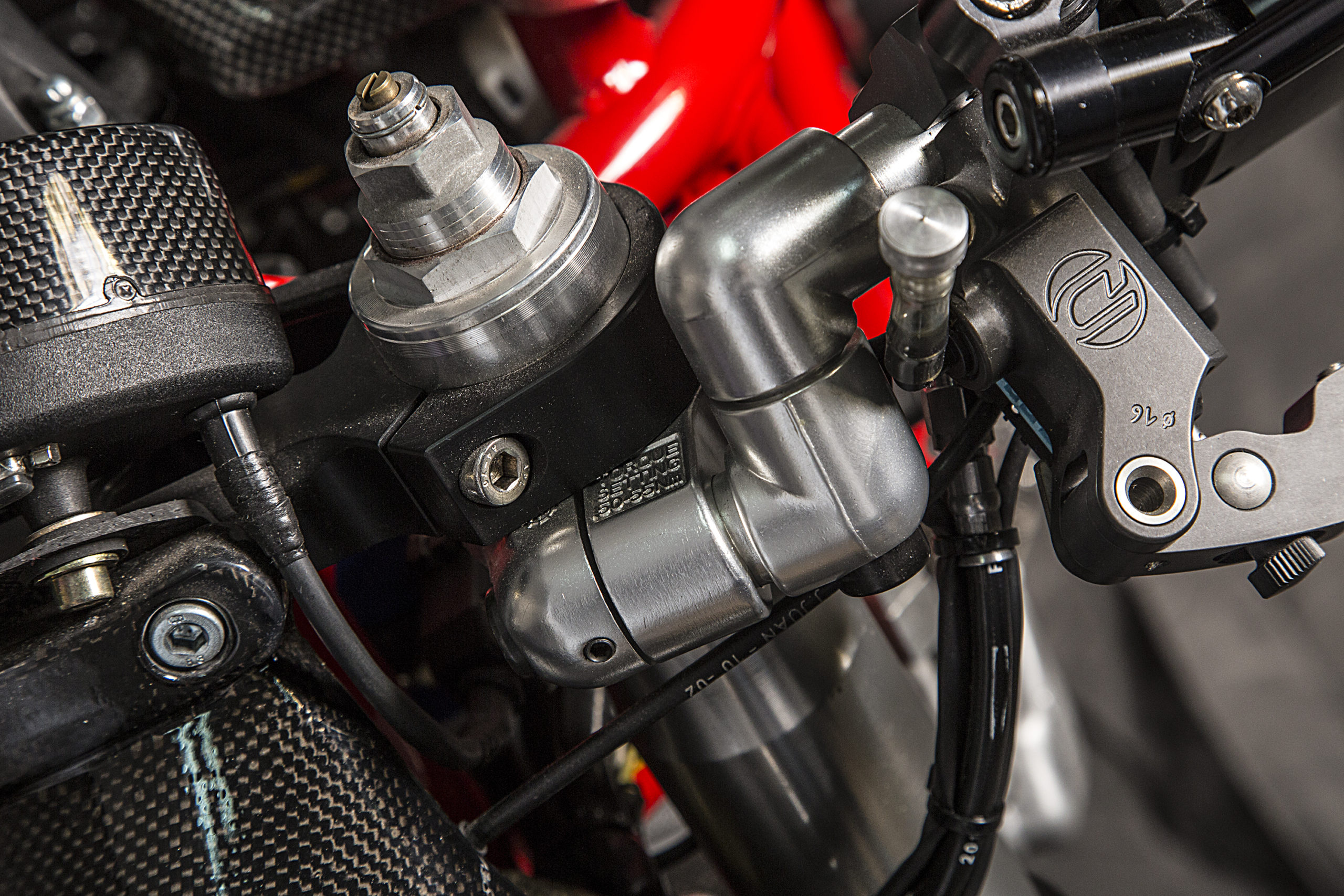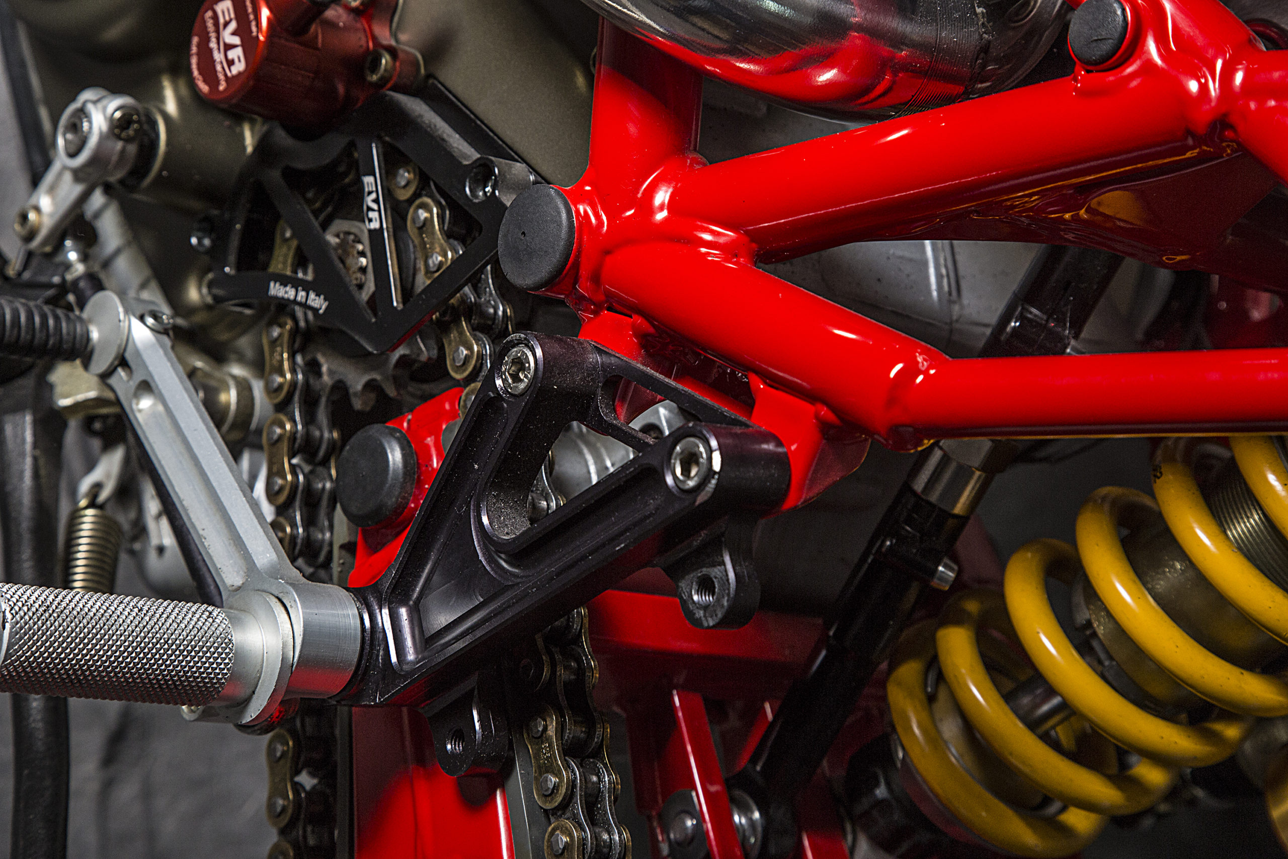 Other features of this beautiful hyper-naked build include a Regulable S2R 1000 fork, tweaked Ducati 749 gas tank (with an endurance quick filling gas cap), a RAD 02 solo seat and a Team Red performance steering damper matched to a SuperMario 2 in 1 exhaust system with megaphone to amplify the original 1000cc Dual Spark engine…just because.