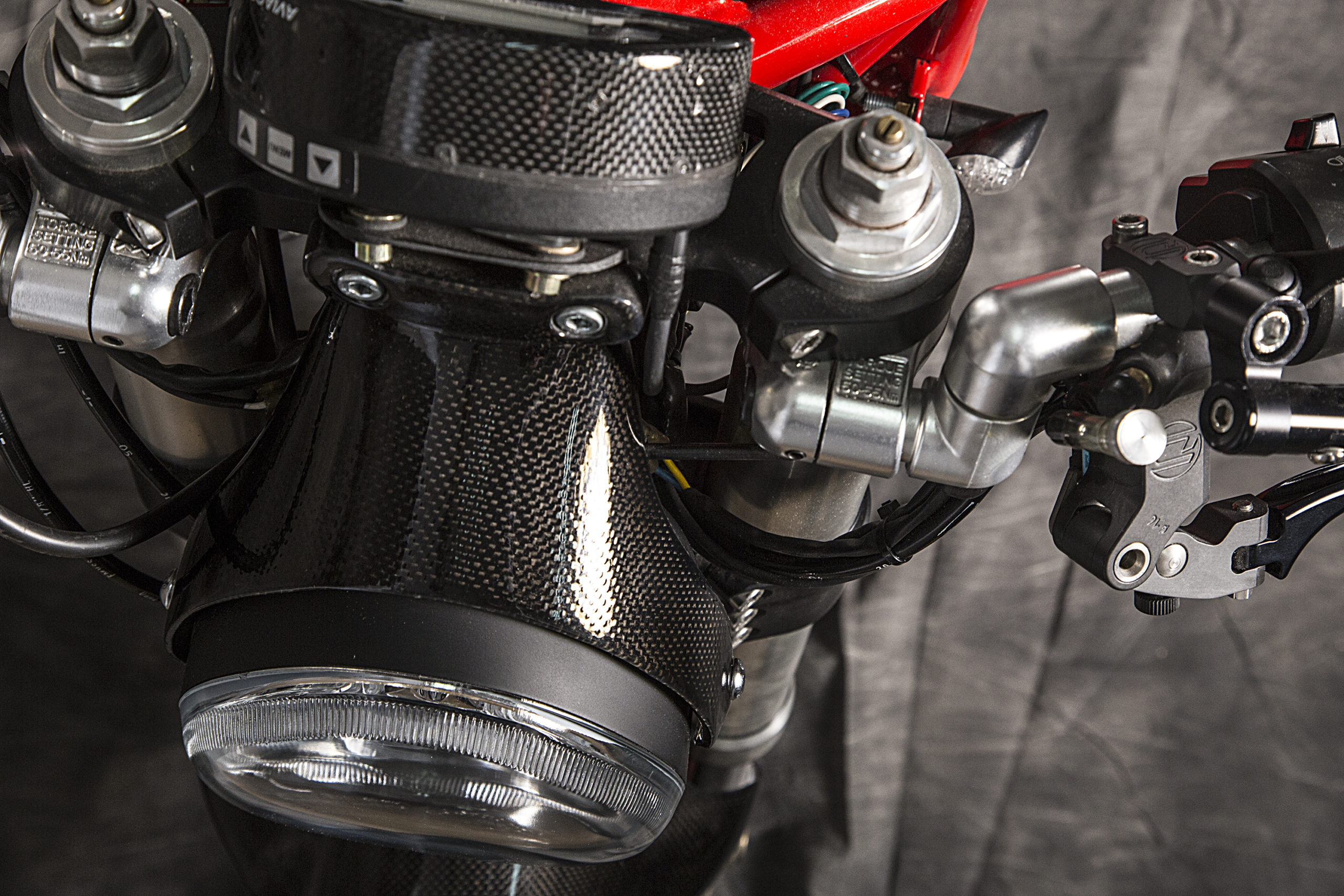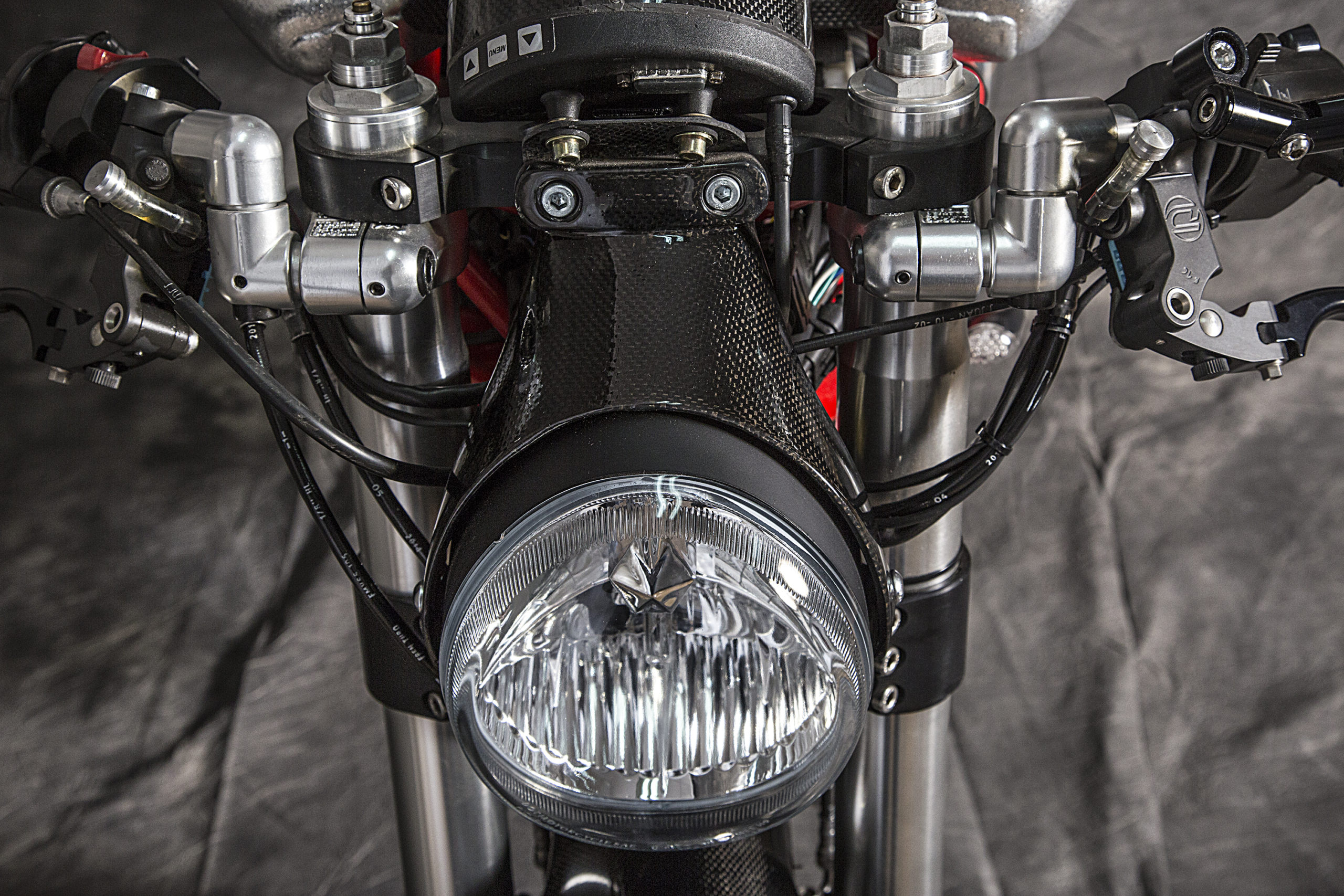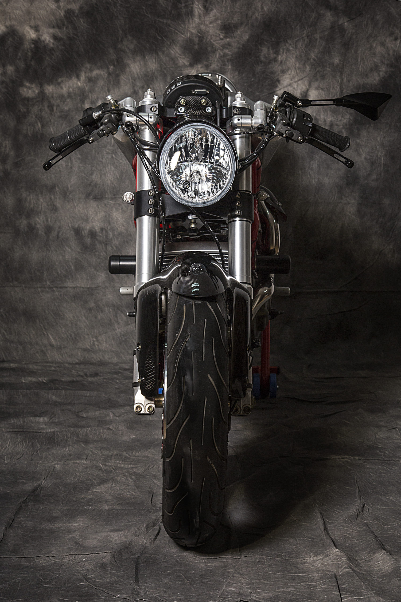 The webpage devoted to the build tells us that a slew of carefully thought-out accessories went into the project, from the host of custom aesthetic pieces (CNC’ed Ergal triple clamps and VERY necessary signature carbon fiber Ducati 1098 front mudguard, along with one-off LED headlight housing and carbon bits and bobs) to the new rear subframe (and modified original frame) showing off the crazy lean in store for whoever plans on swinging a leg over.
