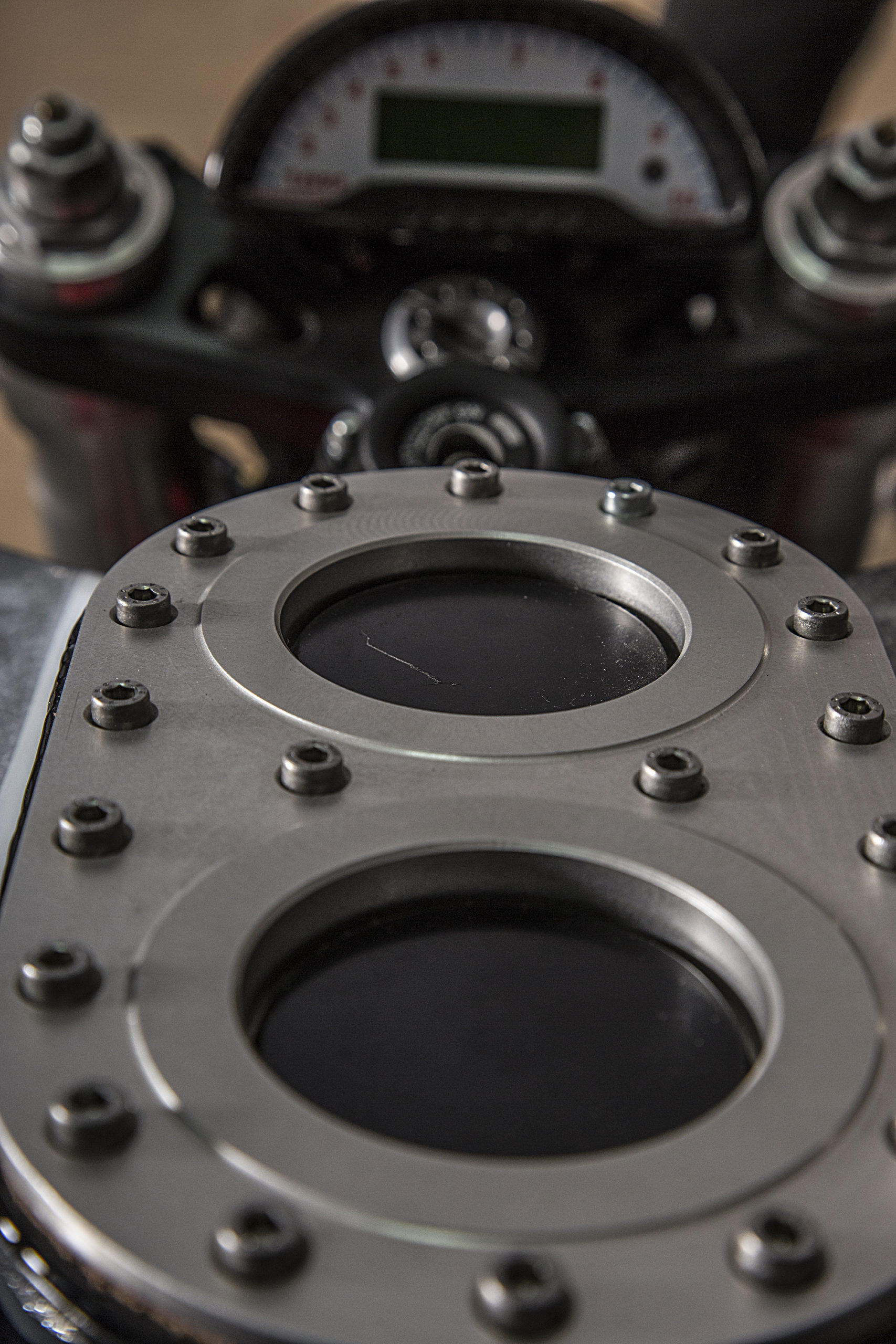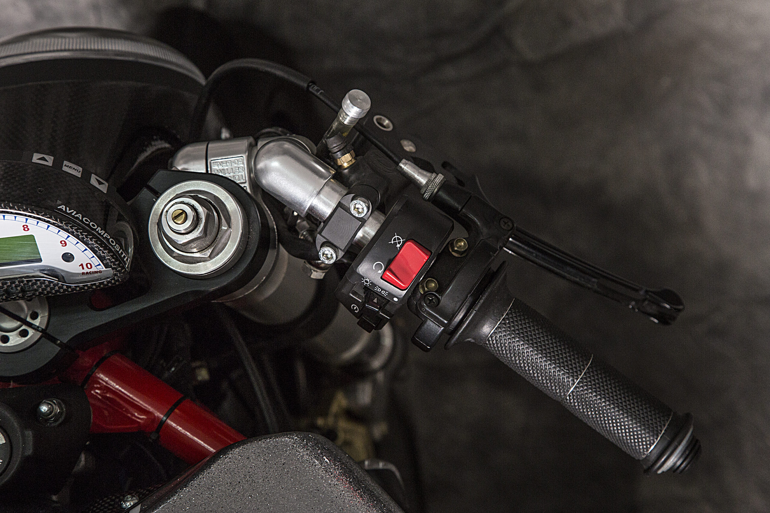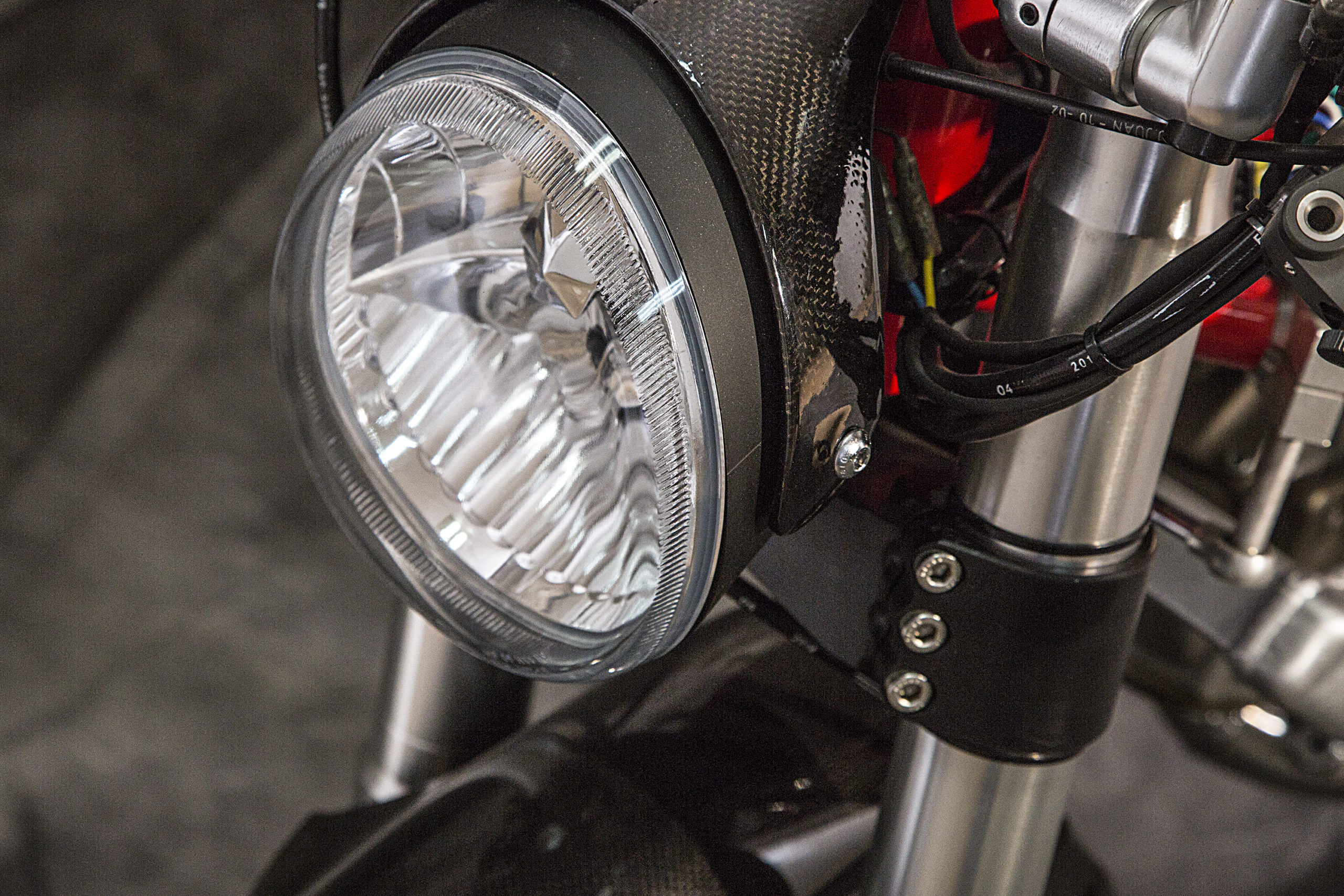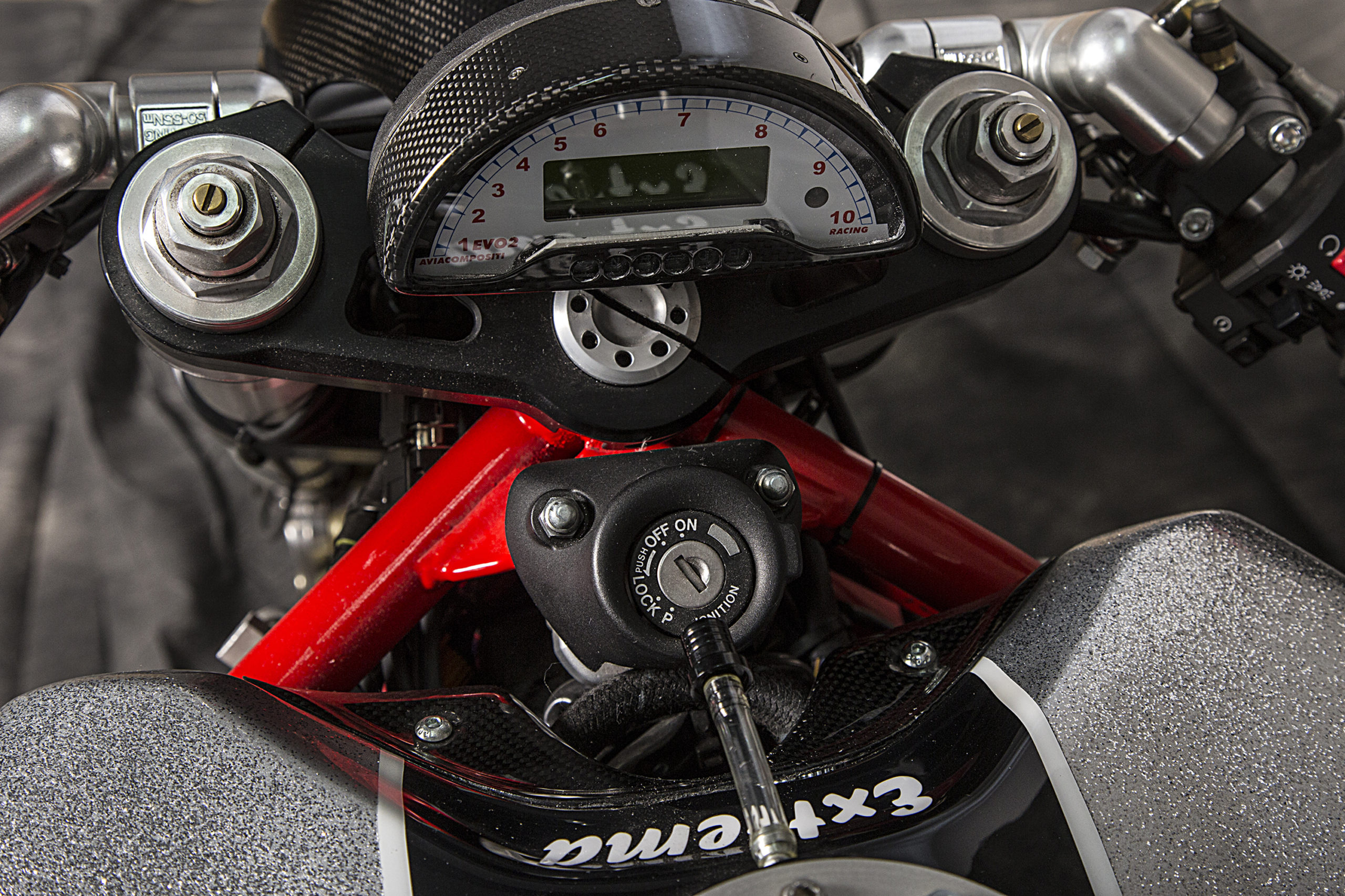 The webpage devoted to the build tells us that a slew of carefully thought-out accessories went into the project, from the host of custom aesthetic pieces (CNC’ed Ergal triple clamps and VERY necessary signature carbon fiber Ducati 1098 front mudguard, along with one-off LED headlight housing and carbon bits and bobs) to the new rear subframe (and modified original frame) showing off the crazy lean in store for whoever plans on swinging a leg over.