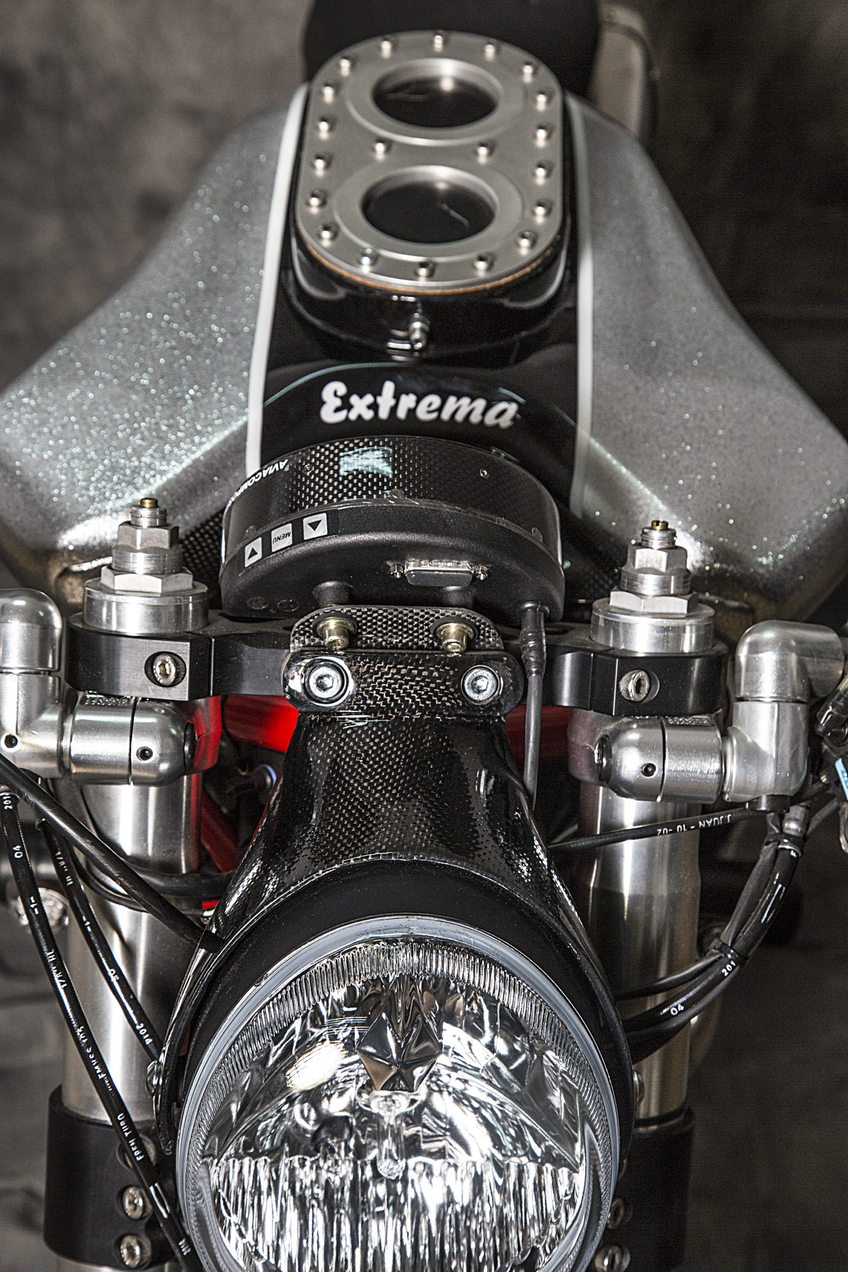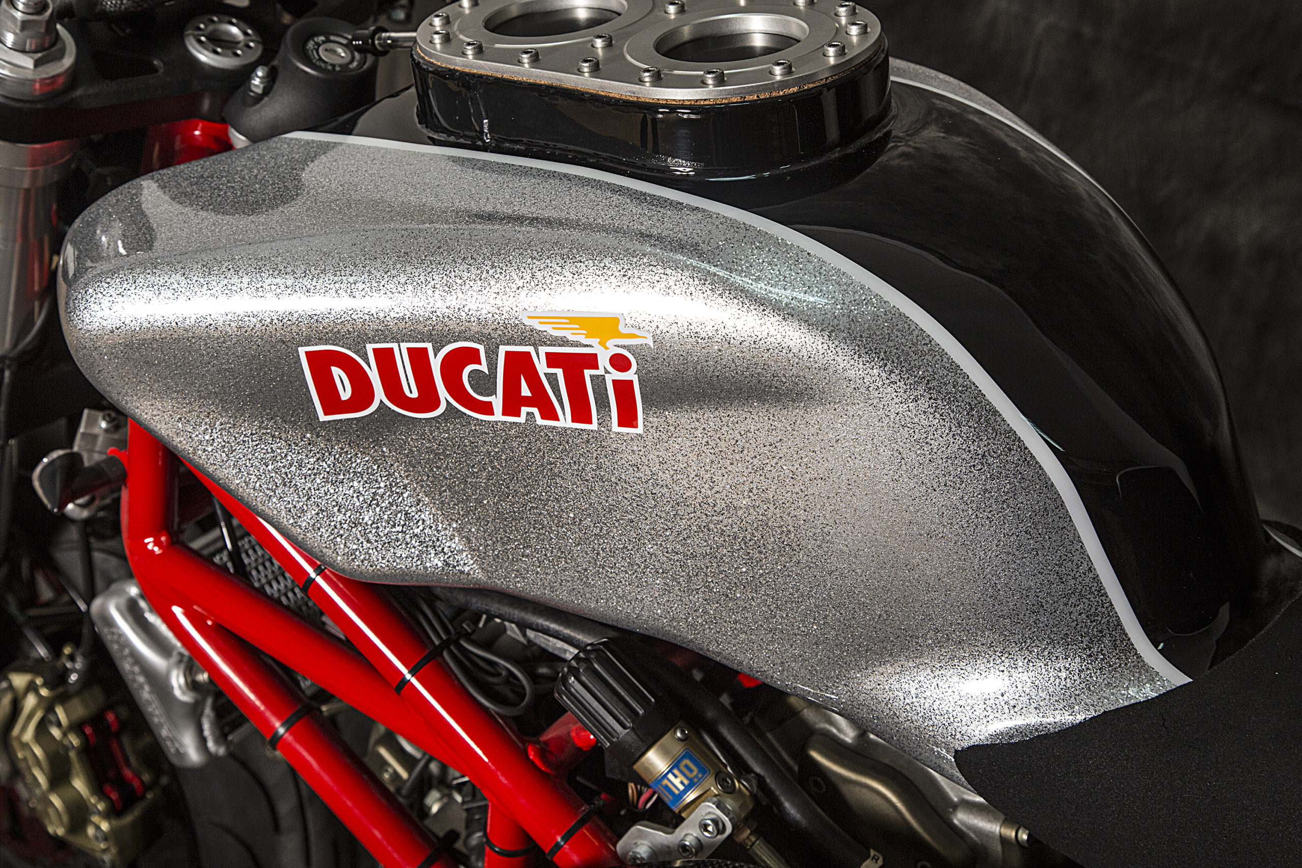 The donor bike for this particular project – an ‘03 Ducati Monster 1000 they’re calling the ‘Extrema’ – is a slick, hyper-naked build designed for both the road and the track, with the madly chunky glitter paint job giving ‘Extrema’ the appearance of a ritzy beast, built to roar in delight at the lineup of green paid into the parts docket.