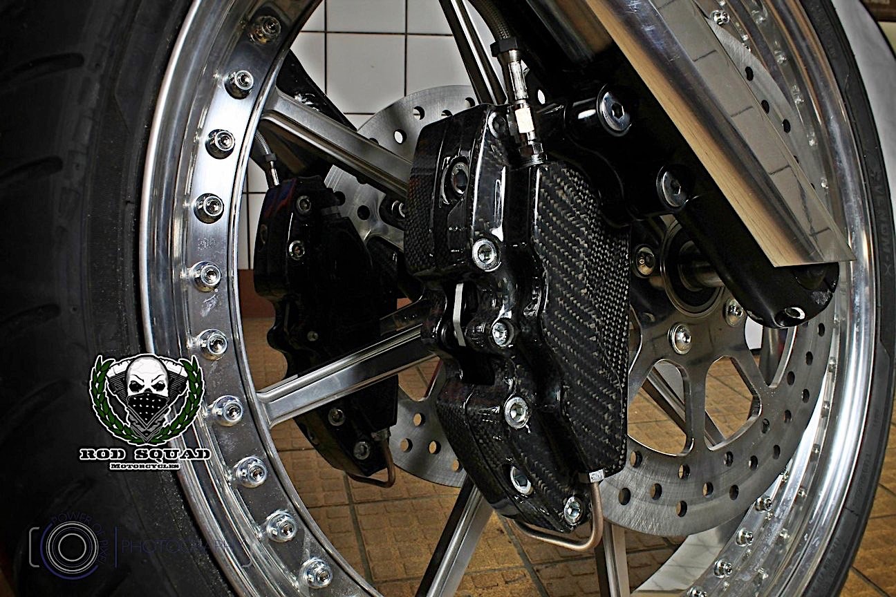 Apparently, the shop responsible for all the carbon bits is NLC, who created custom pieces including units for the “airbox and radiator covers, rear fender, frame triangles, brake caliper, and drive side brake,” as well as “on the lamp housing for the Daymaker LED light or the silencer of the Akrapovic exhaust hardware.”