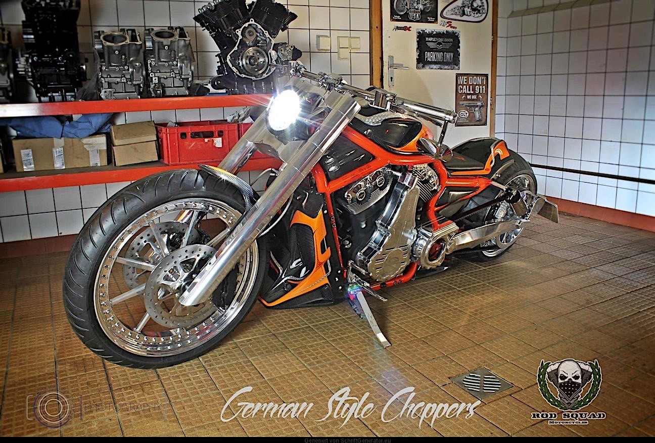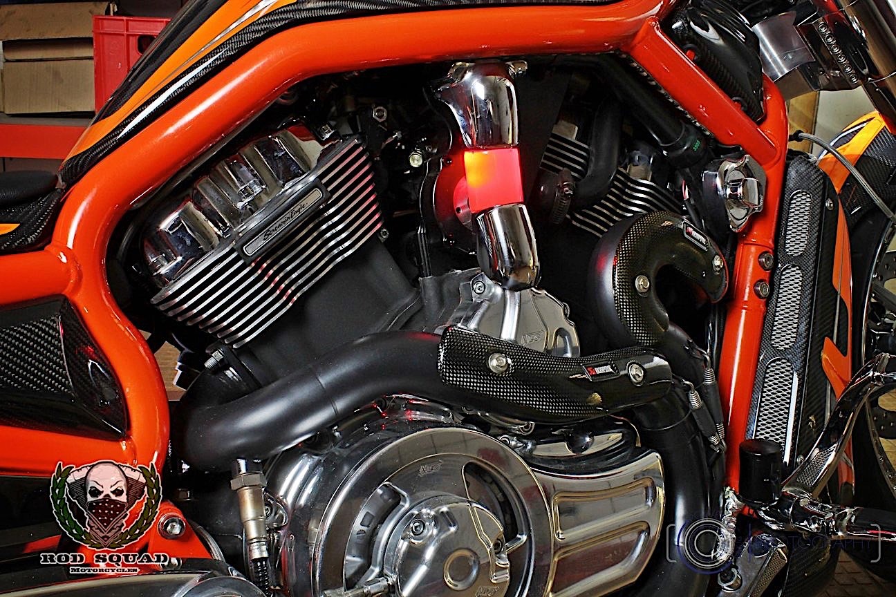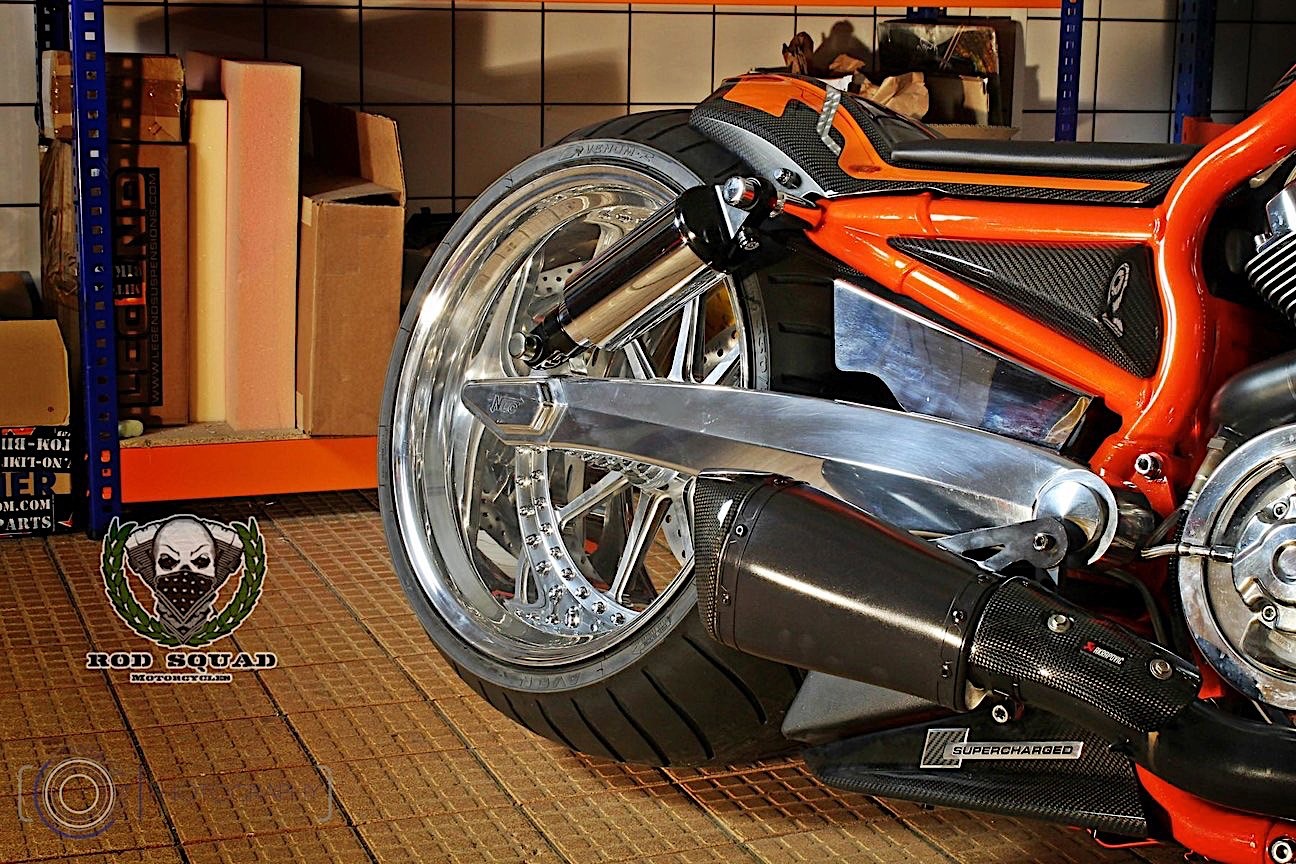 German bike shop Rod Squad has taken a Harley muscle machine and decked the thing out in carbon…plus a couple other nifty features.