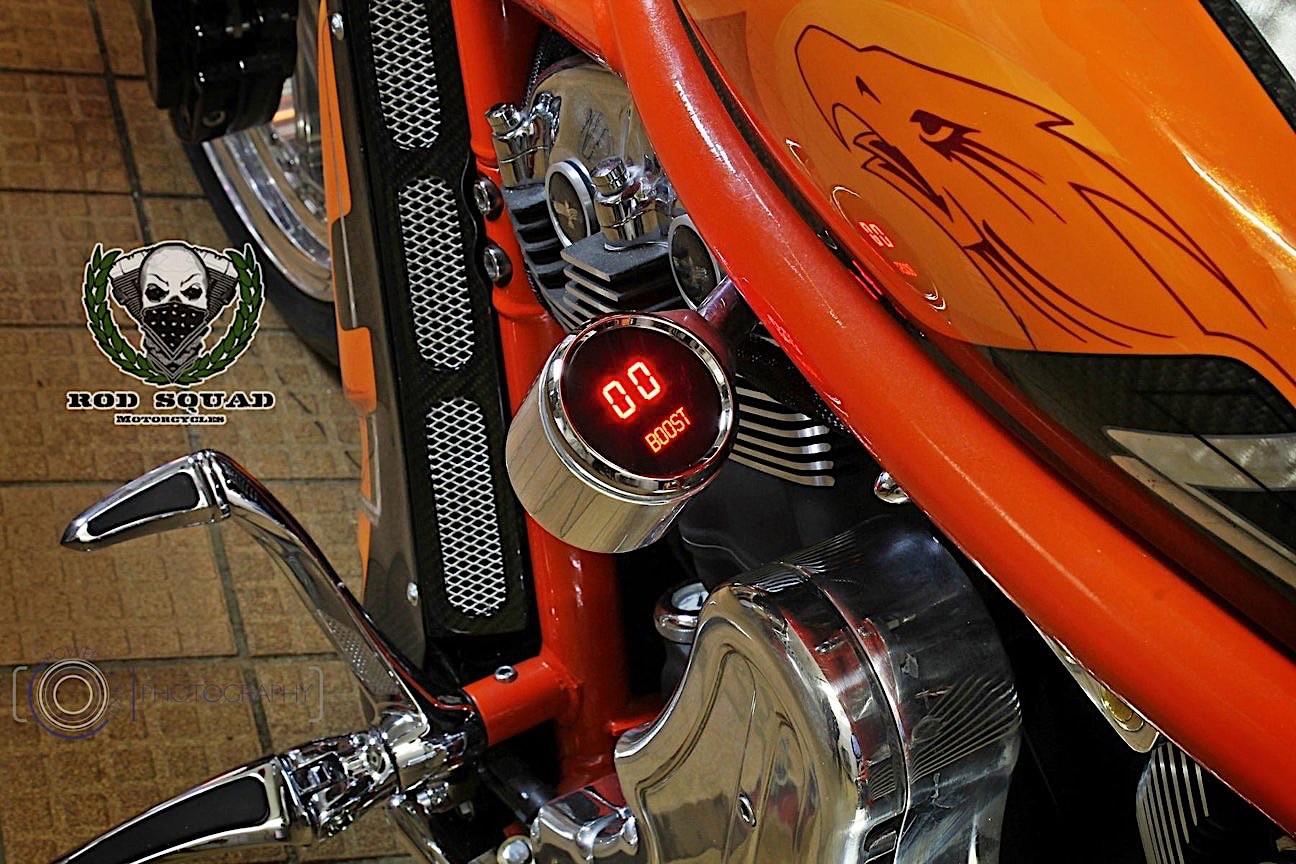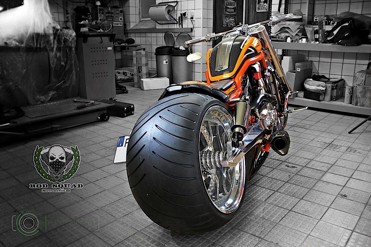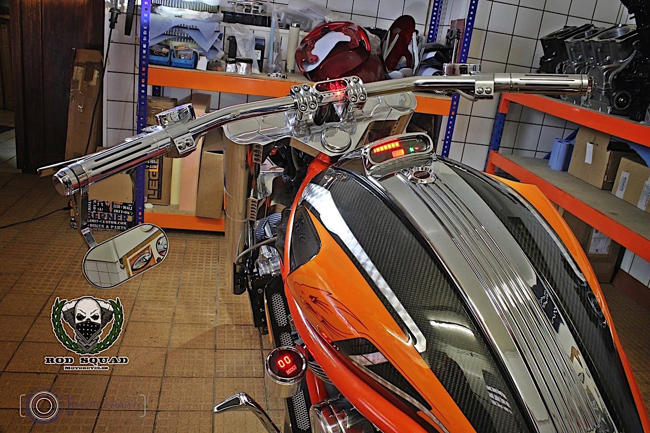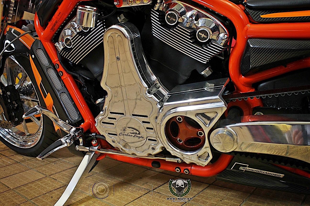 German bike shop Rod Squad has taken a Harley muscle machine and decked the thing out in carbon…plus a couple other nifty features.