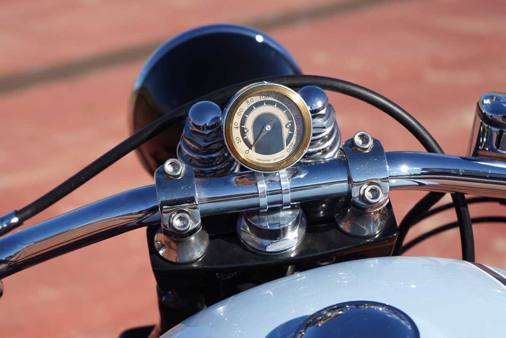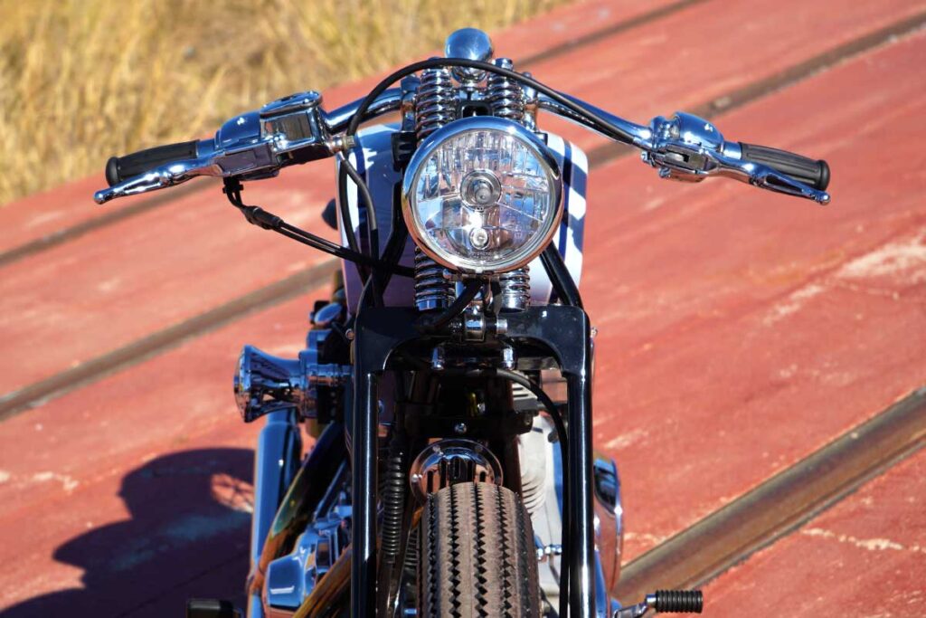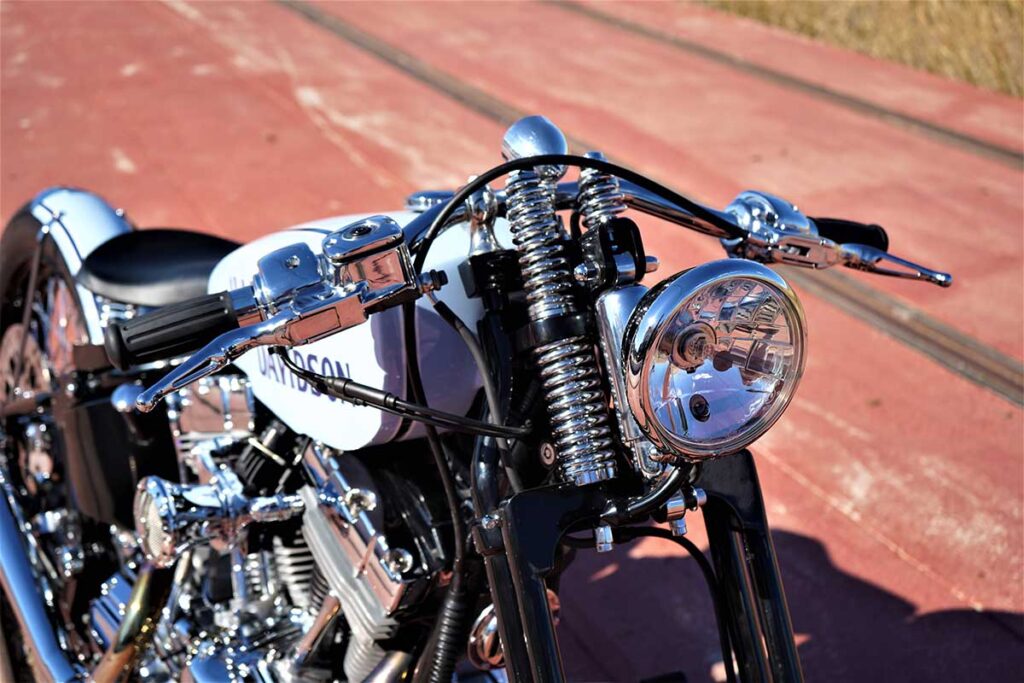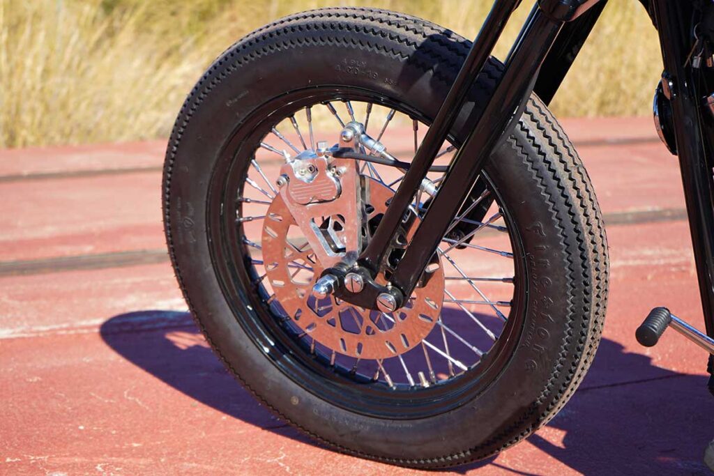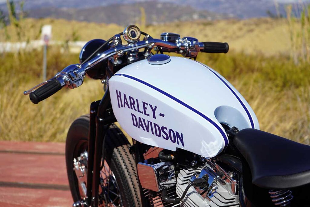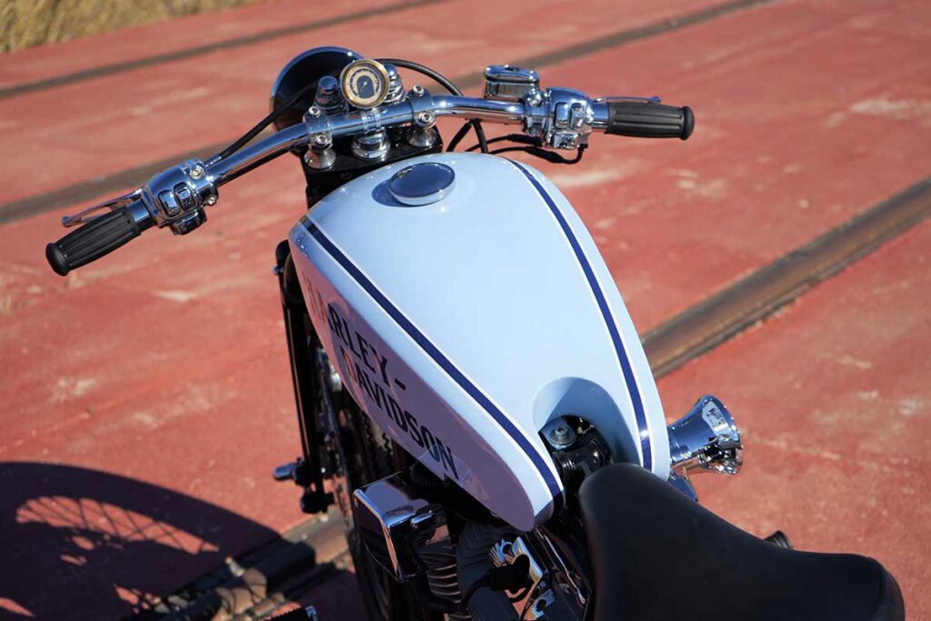 To create this modern, ‘refreshed’ retro vibe, LDK ripped apart the bike, leaving behind only the original Harley chassis and engine. Then, the shop added a Harley springer fork end (not as good as the damping capabilities of a hydraulic fork, but it matches the vintage vibe), along with a Biltwell spring seat, 19” bespoke Firestone Champion Deluxe tires, a Vity’s Design air filter, a Biltwell tracker handlebar, and a suitably retro (tiny) odometer.