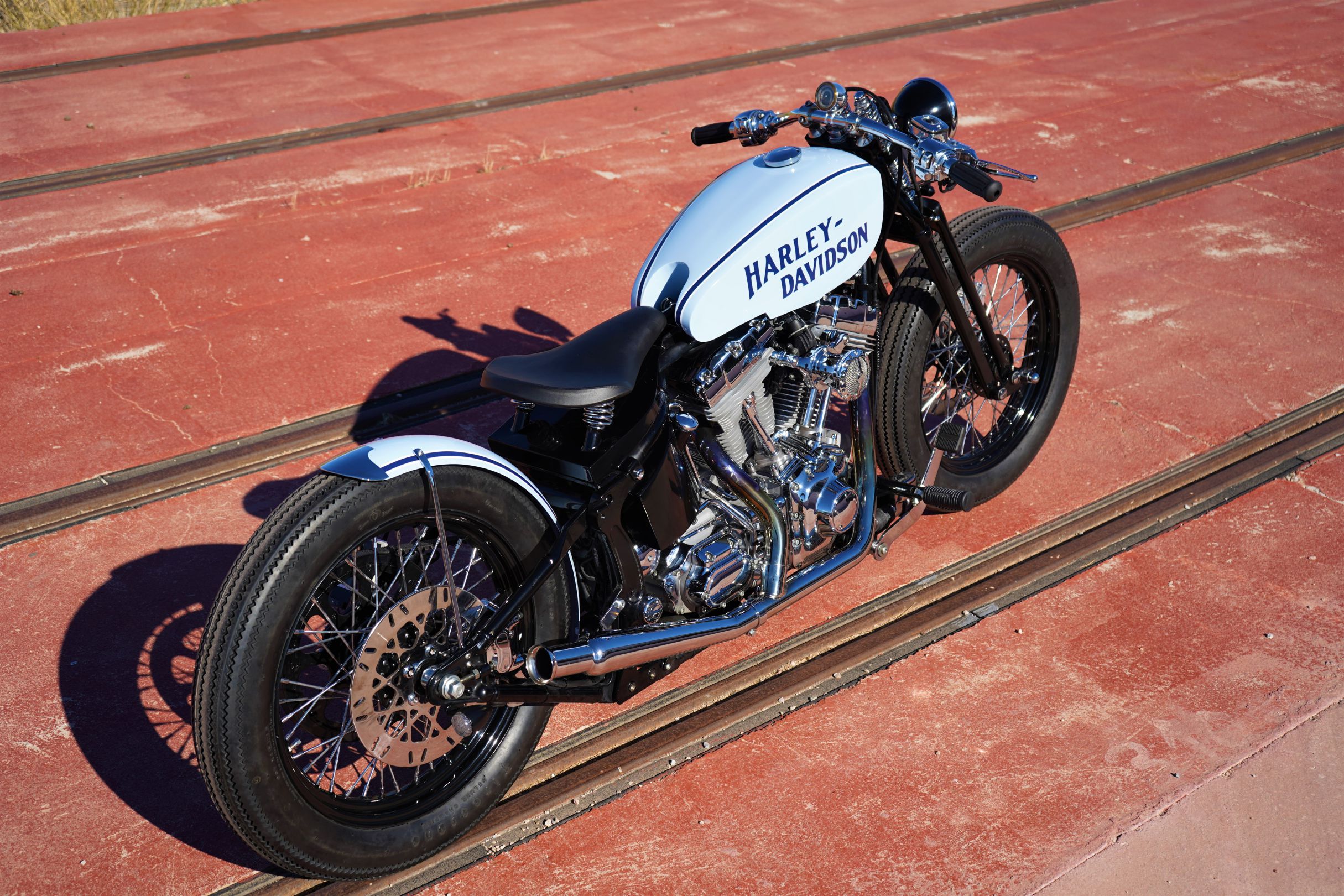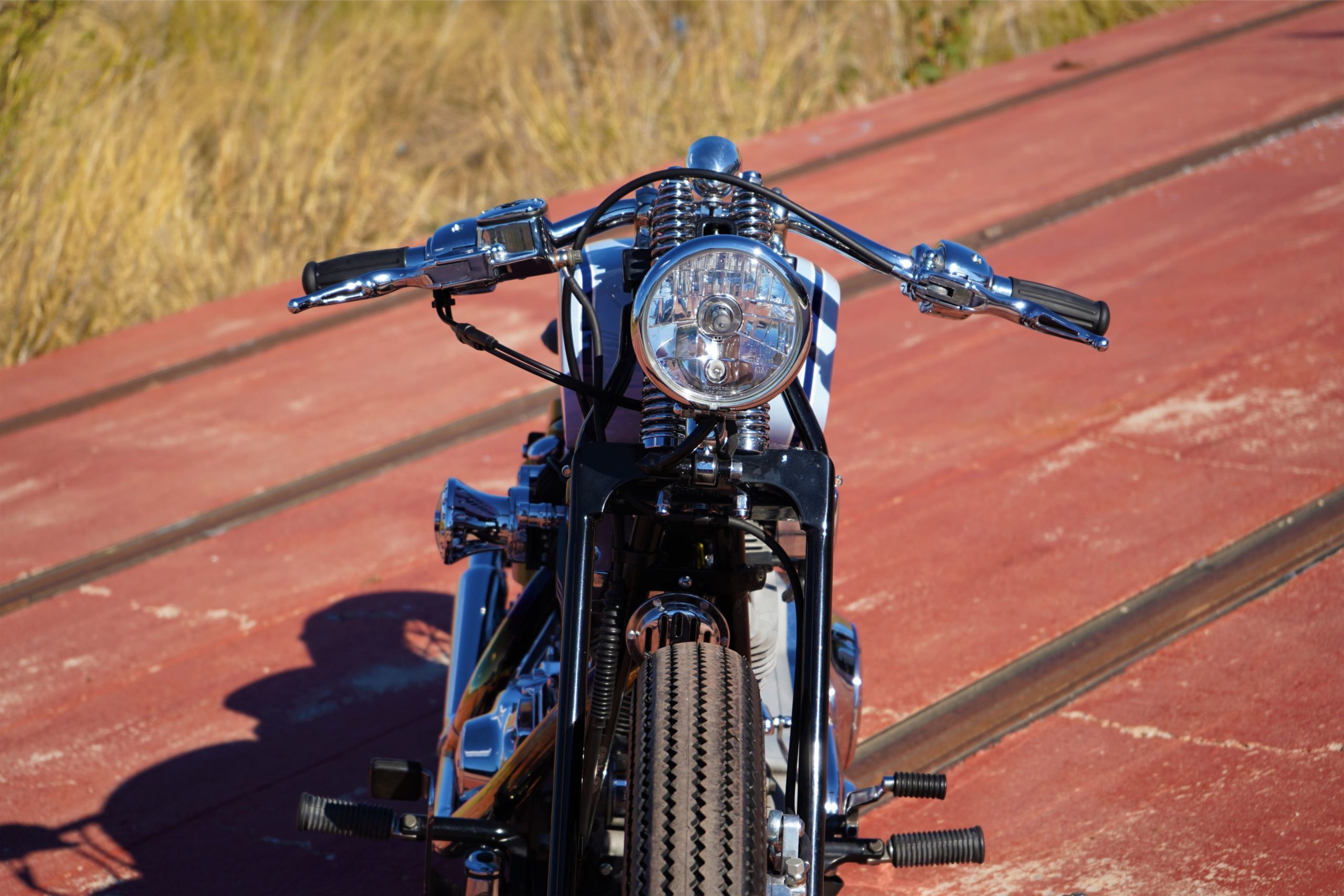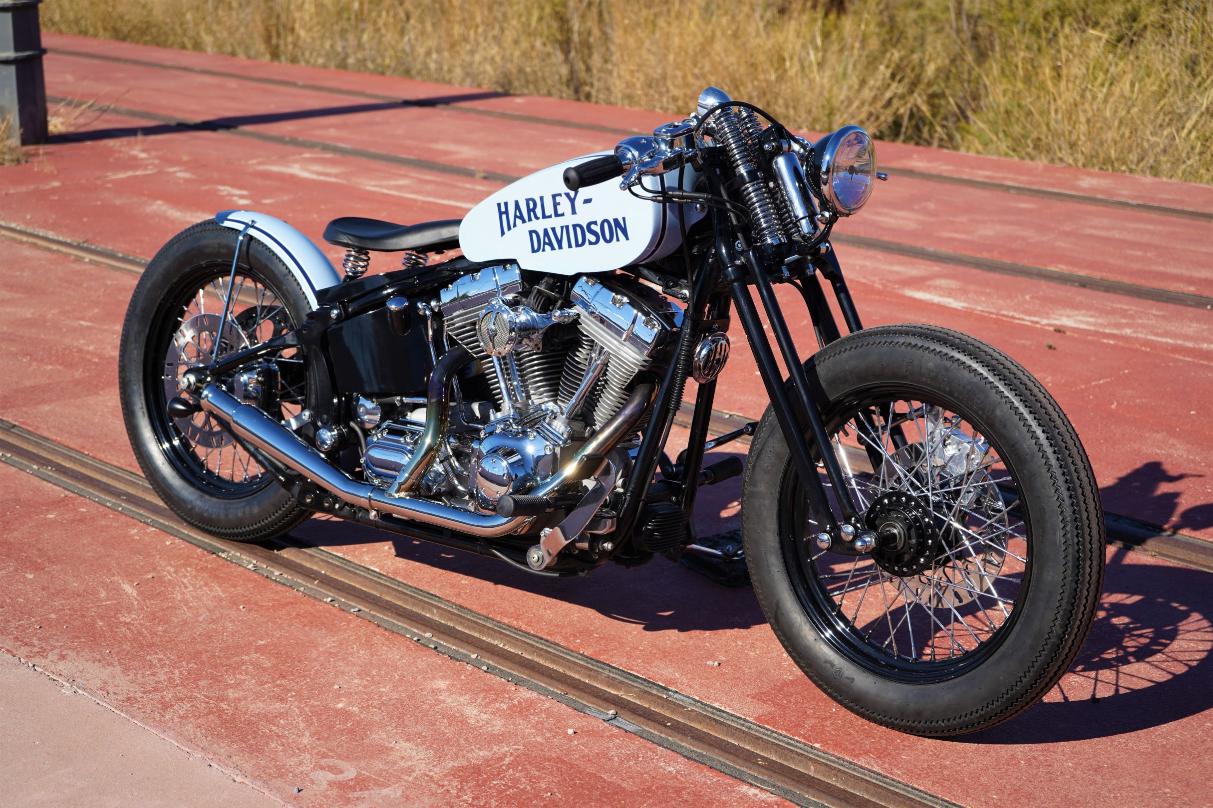 To create this modern, ‘refreshed’ retro vibe, LDK ripped apart the bike, leaving behind only the original Harley chassis and engine. Then, the shop added a Harley springer fork end (not as good as the damping capabilities of a hydraulic fork, but it matches the vintage vibe), along with a Biltwell spring seat, 19” bespoke Firestone Champion Deluxe tires, a Vity’s Design air filter, a Biltwell tracker handlebar, and a suitably retro (tiny) odometer.