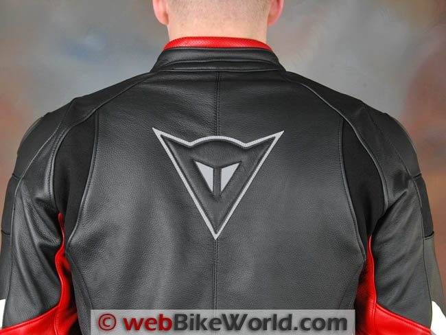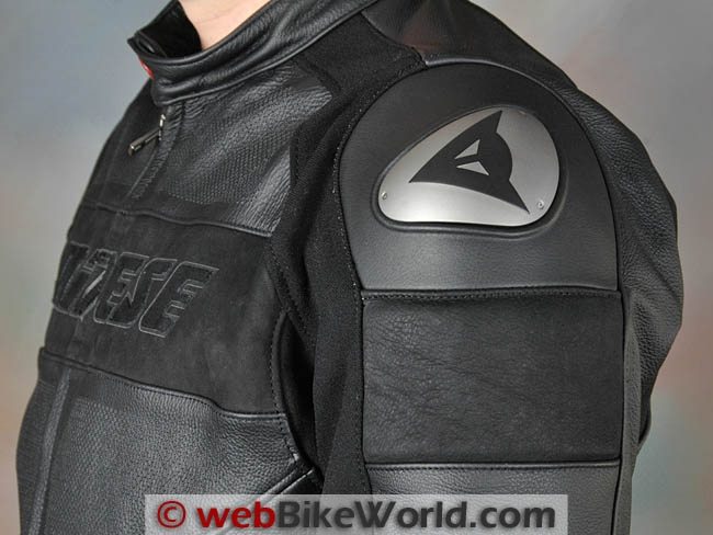 The shoulder armor is integrated into and under the styled metal plates located on the shoulders. This helps make the armor very comfortable and unnoticed. The metal plates are embedded in a leather surround with a raised edge surrounding the plate, which has the Dainese bat or devil logo displayed.