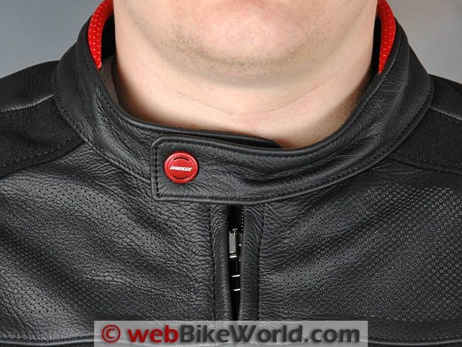 The collar has a metal snap labeled by the manufacturer “AMF Italy” and it has a red anodized coating and the Dainese script on top. Two mating snaps on the opposite part of the collar allow for adjustment; I use the farthest snap, so there’s plenty of room for larger-sized necks as mine runs about 17″.