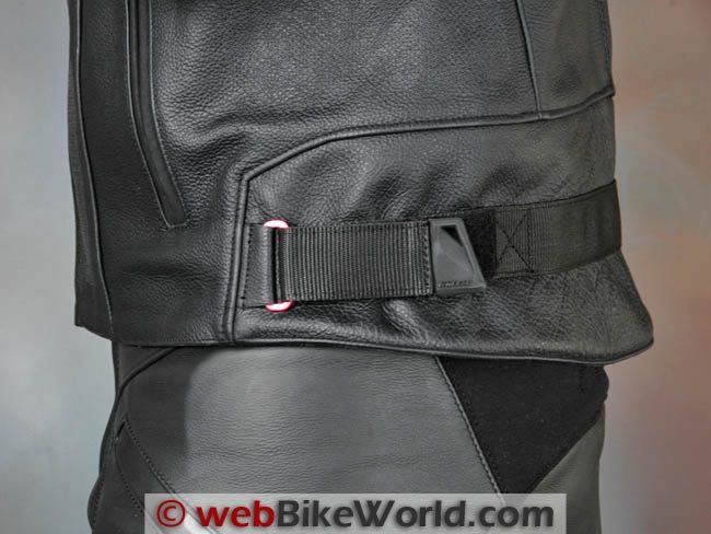 The hem at the bottom of the front of the jacket zipper does not have a snap; a result of its street/sport intentions no doubt and unnecessary in any case. The absence of a snap in this area gives the lower part of the jacket a smoother appearance and avoids the problem of scratching the paint on the fuel tank.