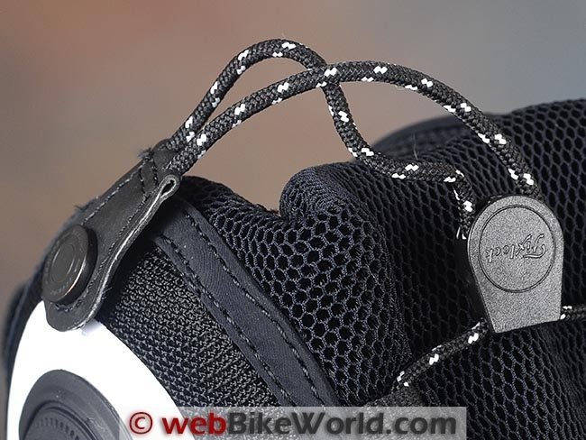 Then the Cordloc 192 “Cord Lock” (labeled “Fixlock”) speed lacing lock is a spring-loaded slider that is used to tighten the laces — you basically pull on the laces to get them tight across the top of the foot, then slide the slider down and let go of the spring, and the laces are held in place.