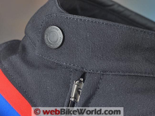 The jacket collar is edged in the same type of leather and it has two more metal snaps for adjustment. The collar on a lighter-weight summer jacket doesn’t have to be as snug as a winter garment, so attaching the collar at the first snap seems fine and leaves the neck with a slight gap for air circulation.