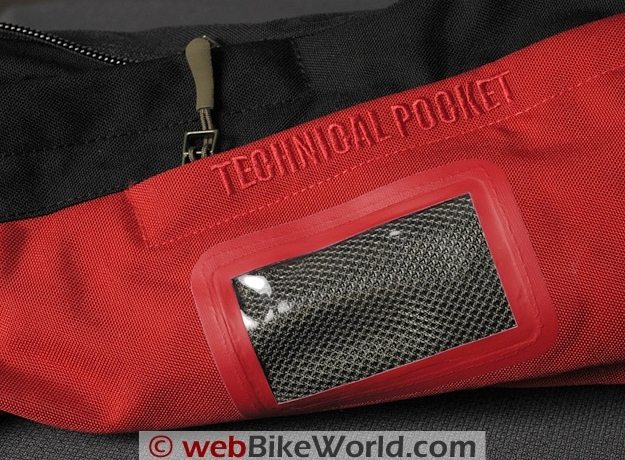 The left sleeve has a clear vinyl covered “Technical Pocket”, accessible through a smaller zipper inside the left arm vent zipper. This pocket can be used to hold an ID card or possibly an electronic toll pass (or money). The pocket has a 100 mm wide entry and it’s 80 mm deep.