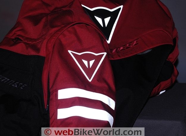 The jacket has a pair of highly reflective strips on either sleeve, along the lower sides and behind the Dainese Fox head logo on the sleeves and the rear of the jacket.