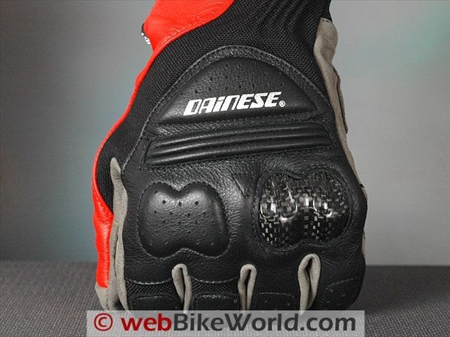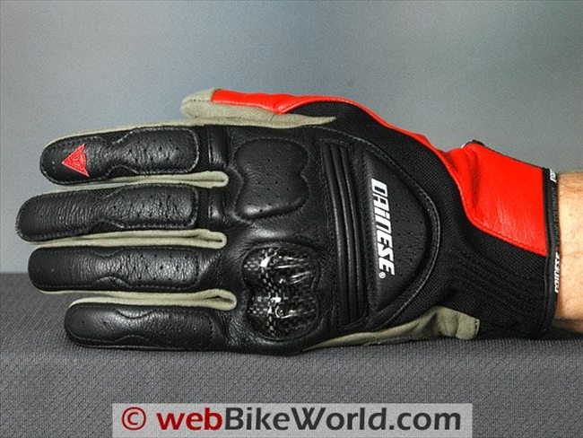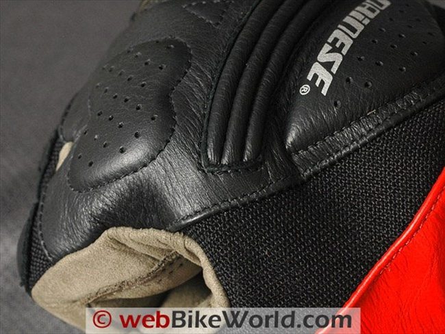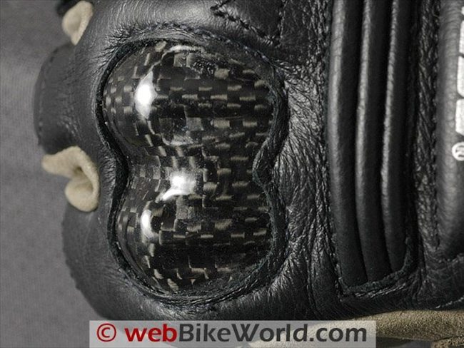 The extra leather sections on the palm and the heel, along with the carbon fiber knuckle protector on the 3rd and 4th knuckles only, is pretty much the only extra protection on the X-ILE gloves. The thick-ish leather used in the body of the gloves and some padding on the back of the fingers and top of the hand also helps.