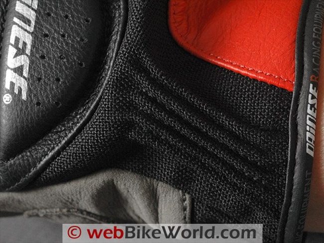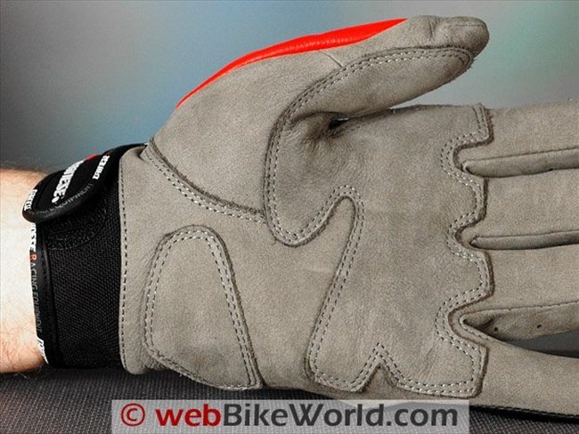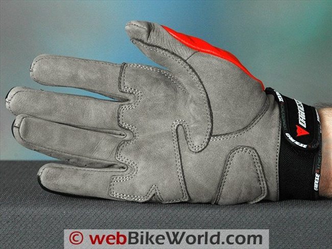 The thumbs on motorcycle gloves can sometimes cause fit problems, but somehow Dainese got this right also. The red leather swirls down over the top of the thumb but ends before the tips. It uses a blind stitch on the outside. The bottom of the thumb is constructed from the gray nubuck leather and it all comes perfectly together — not too loose and not too tight.