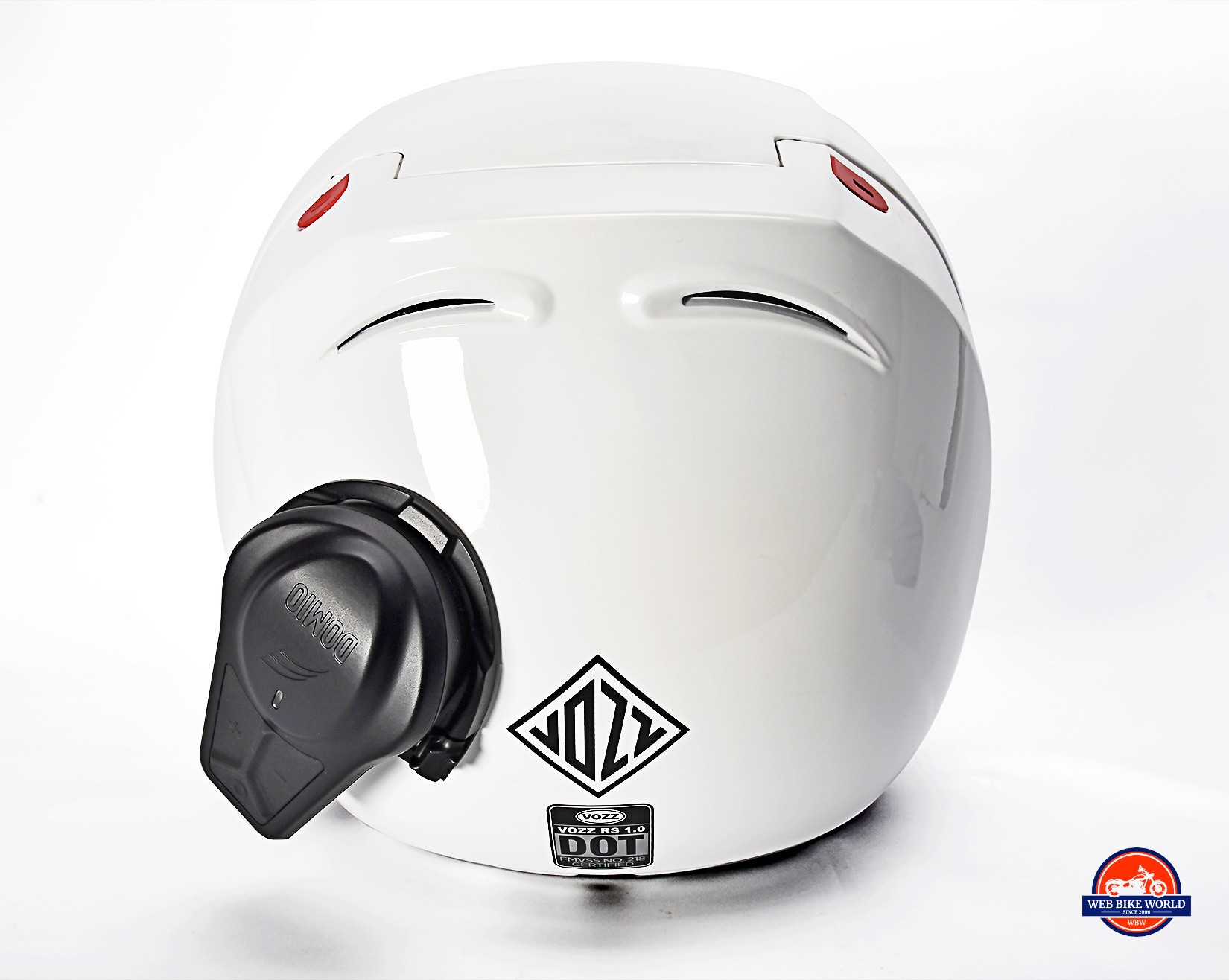 The unusual hinge opening on the back of the Vozz RS 1.0 helmet makes mounting any other kind of music device than the Domio very challenging.