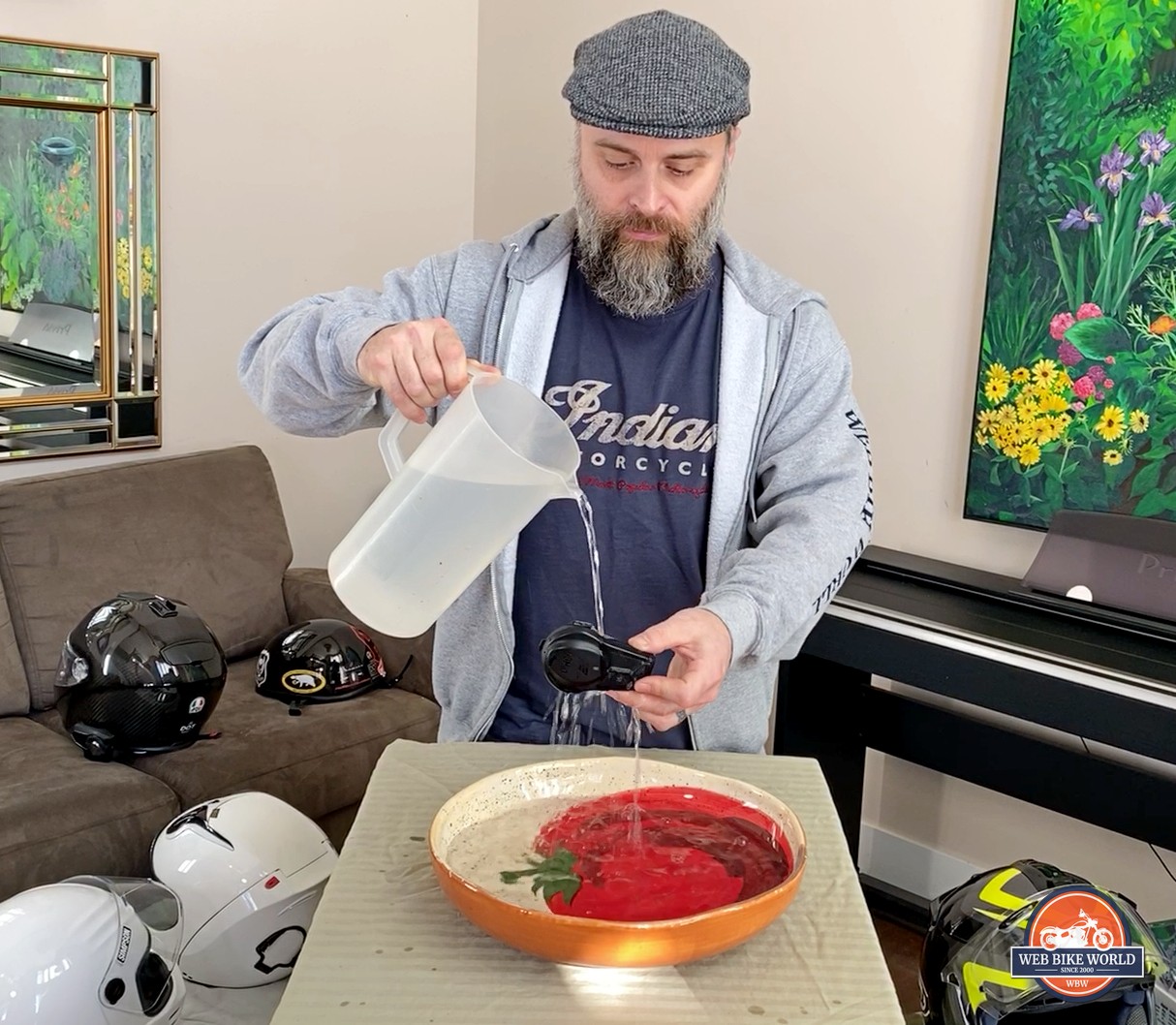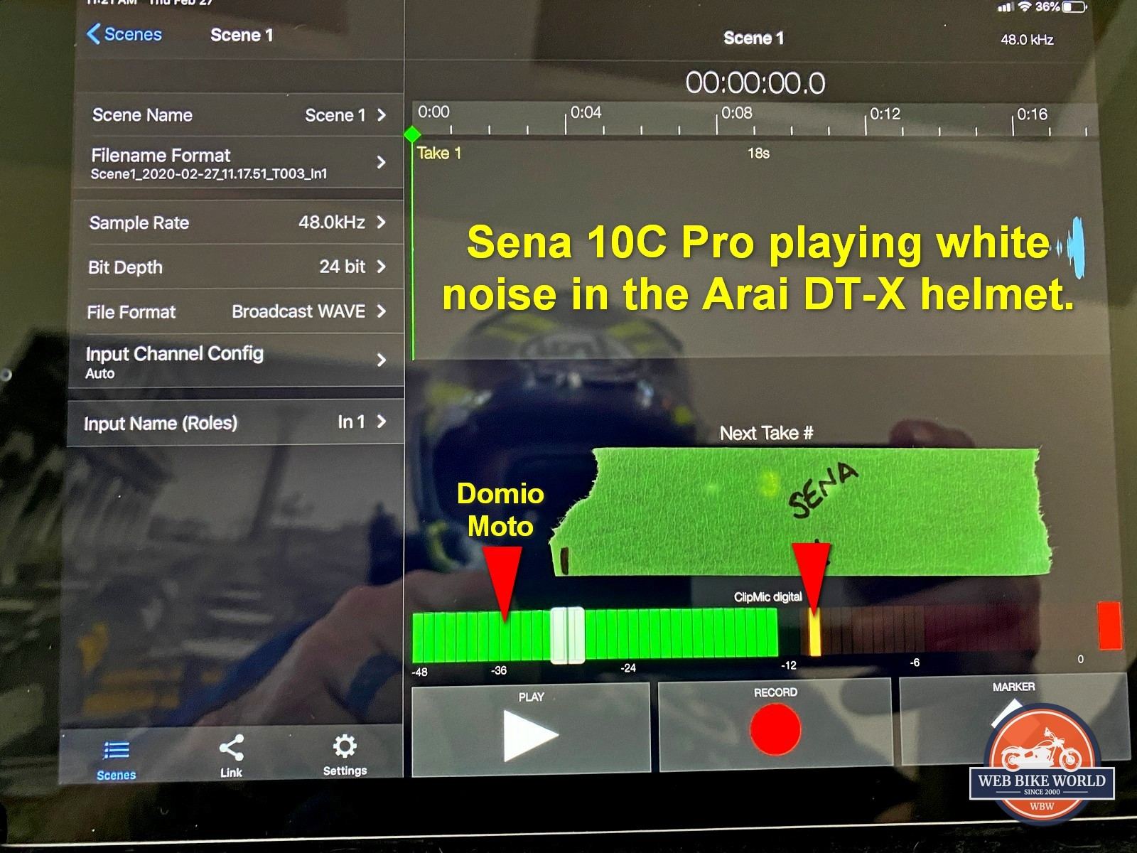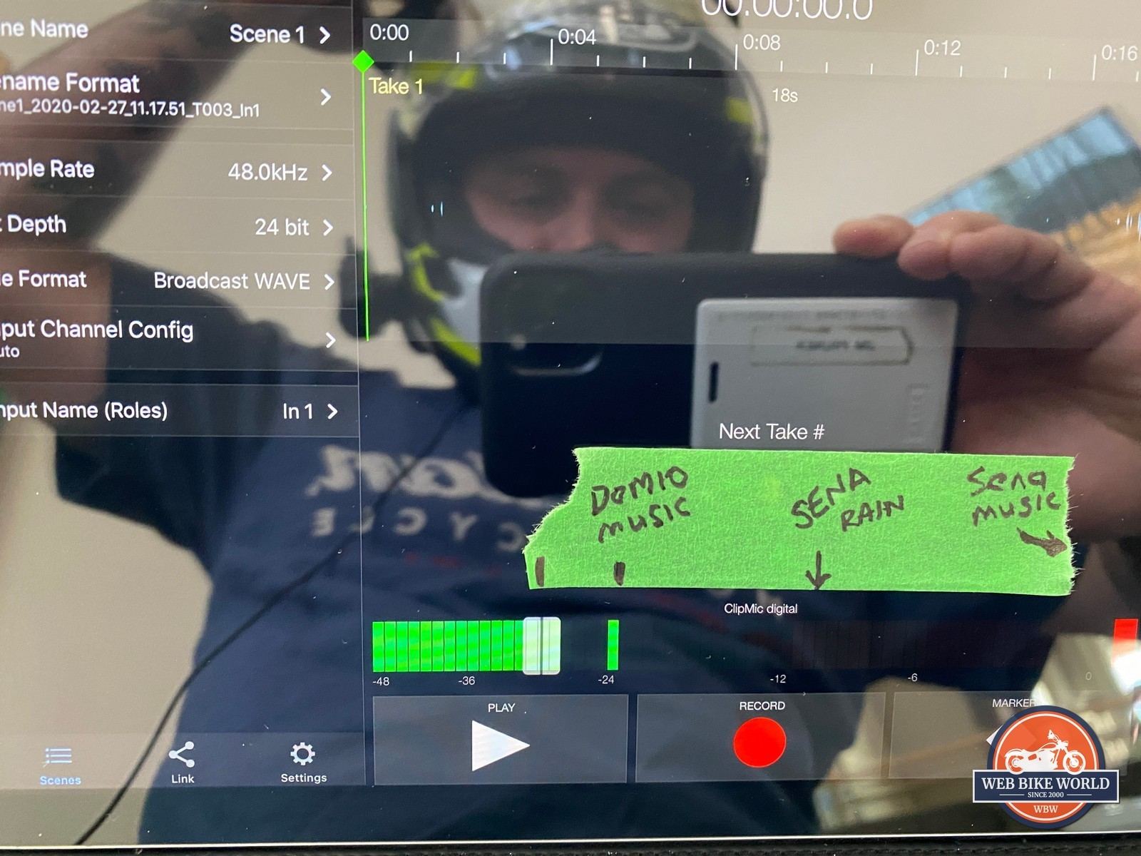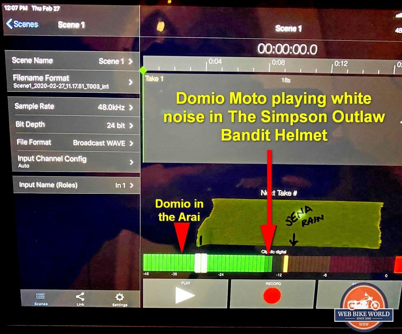 I set up an experiment in sound measurement using a lavalier microphone taped to my left ear inside each helmet and an audio recording app on my iPad Mini. The Apogee recorder app on my iPad visually indicated how much sound was being picked up where the wearer’s ears sit in the helmet.