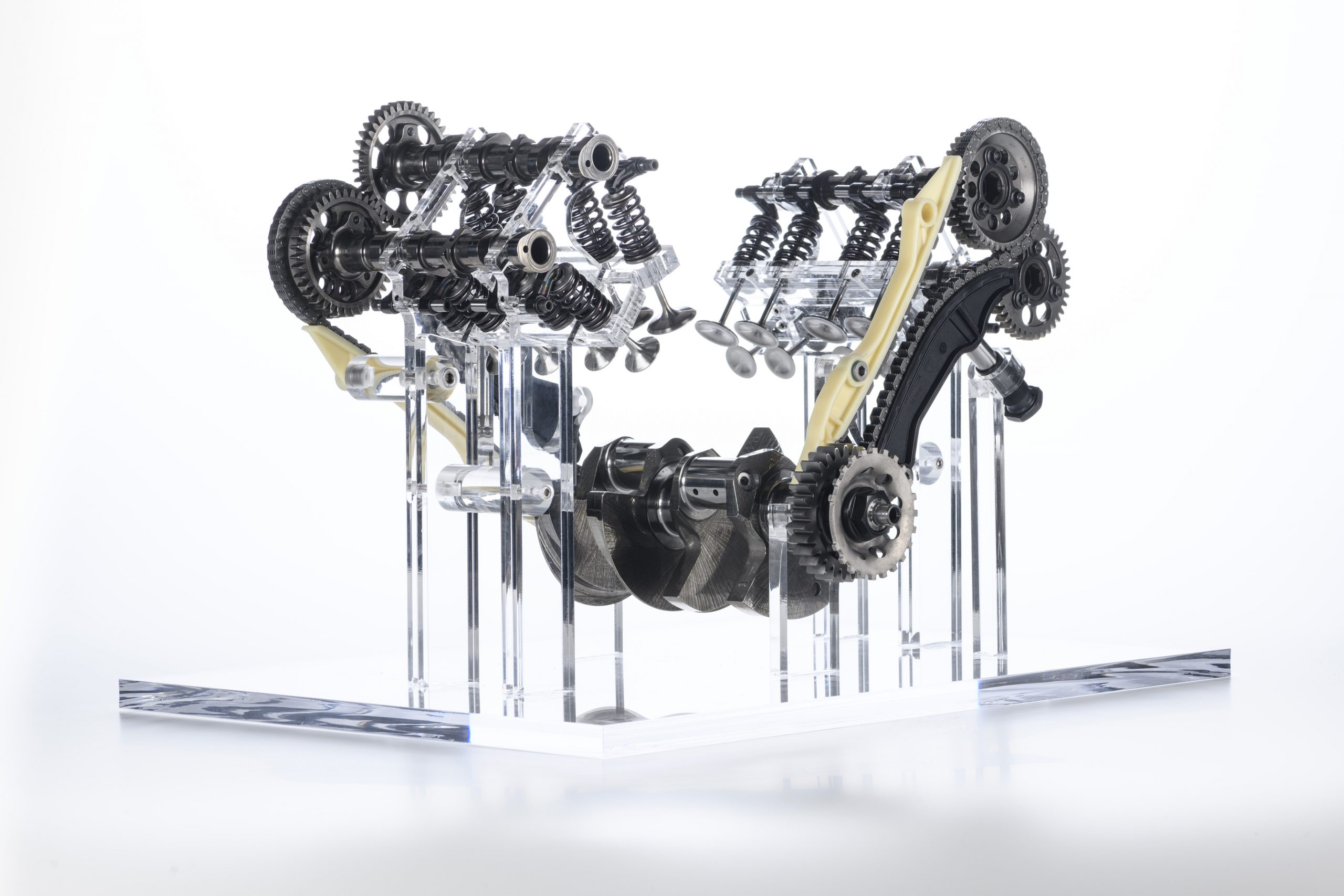 - Distribution part chain, part gear – timing with dual overhead camshaft, 4 valves per cylinder