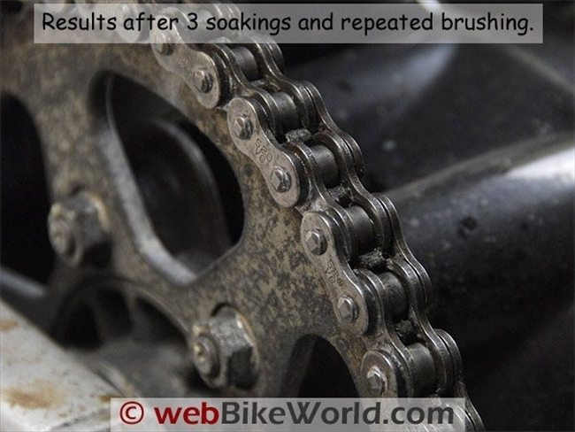 It actually took three complete soaking/brushing cycles to get all the junk off this very dirty chain.
