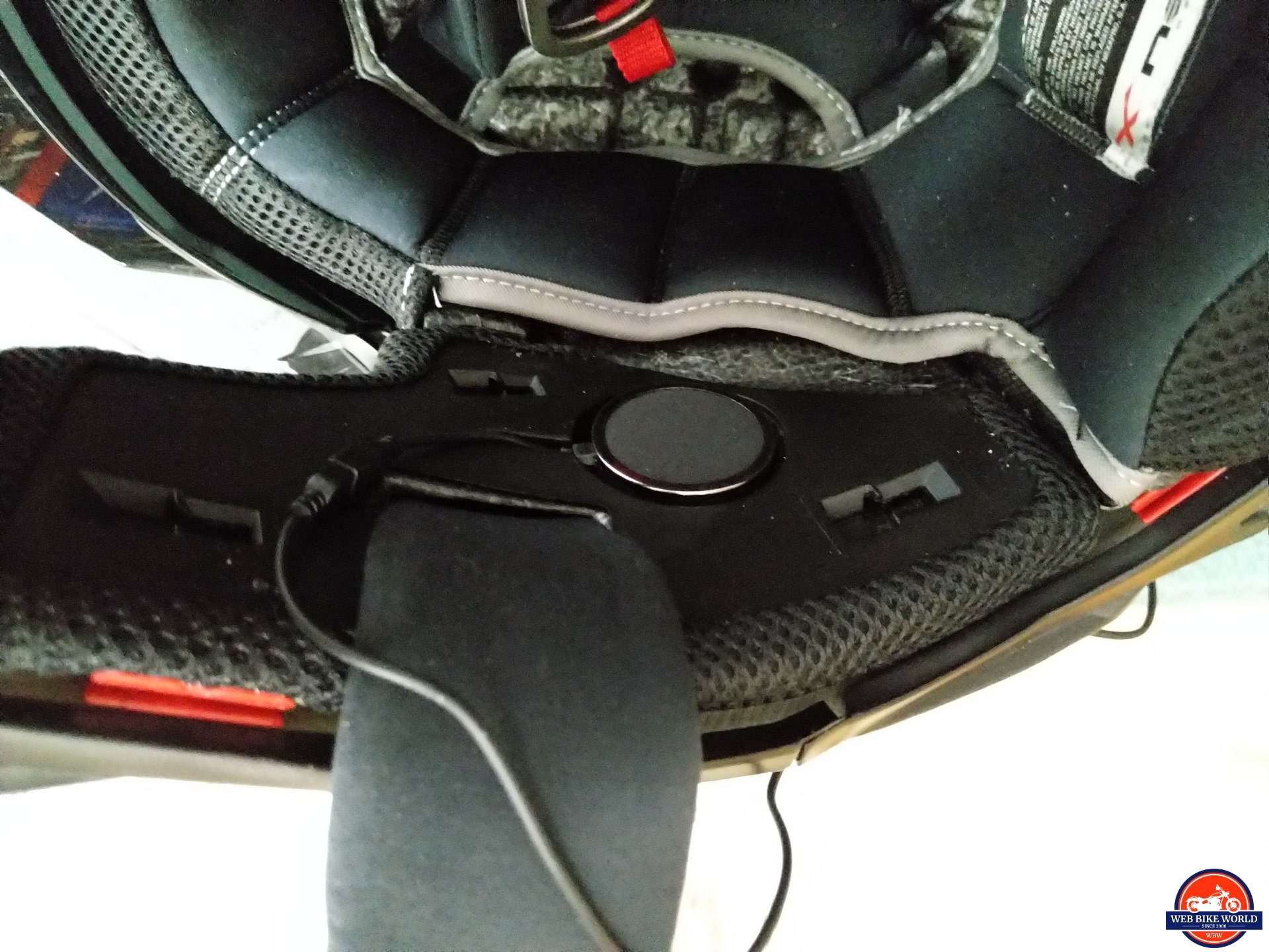 The 40mm speakers slip nicely into the EPS recesses, with the speakers oriented so the leads exit via the small channels in the lining. The thin wire microphone is tacked in place to the immediate left of the mouth, more or less out of line of the free-flow front intake with its warm weather mesh insert still installed.
