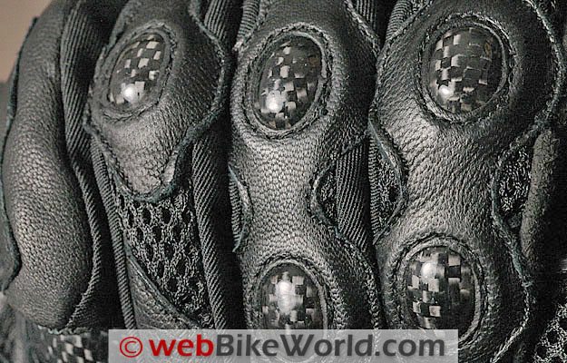 The base knuckle protector is double-stitched into a section of soft leather that is semi-floating on the back of the hand. The carbon fiber heel protector and secondary knuckle protectors are single-stitched on to leather sections that hold the protectors in place.