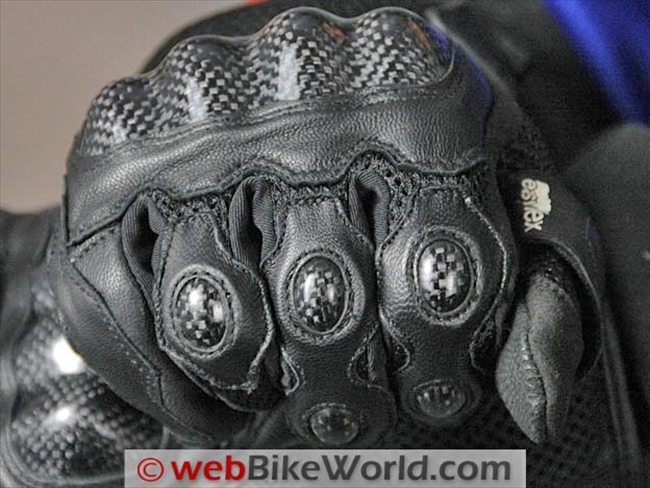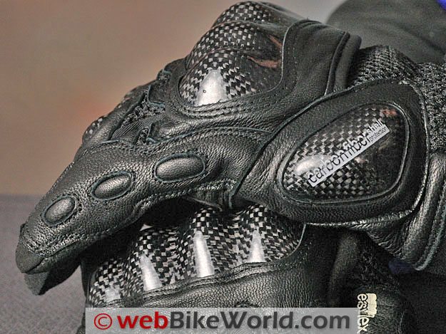 The H2 gloves are biased towards protection with the use of a large carbon fiber protector over the base (main) knuckles. The gloves also include carbon fiber sliders over the first and second knuckles of the forefinger and second finger and one over the middle knuckle of the third finger. A separate carbon fiber slider helps to protect the outside of the heel of the hand.
