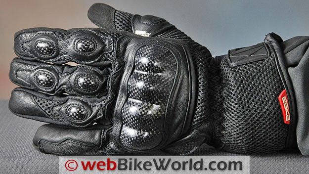 The Eska H2 gloves feature an open-weave mesh fabric in the main body of the H2 gloves, but the bias is towards protection, so large portions of the mesh are covered by leather, carbon fiber protectors and other features. This is the compromise; the solid fabrics diminish the amount of air that can flow through the gloves.