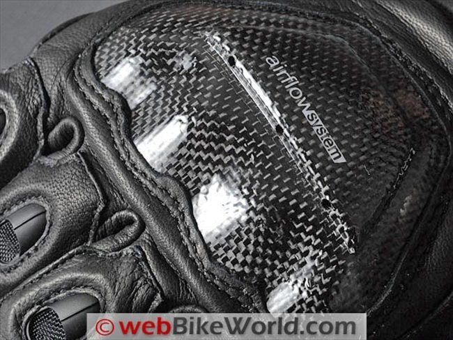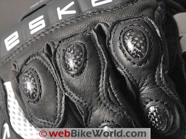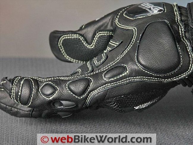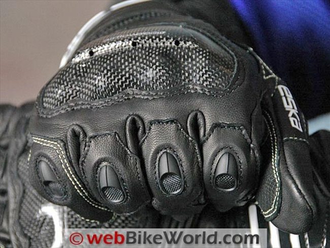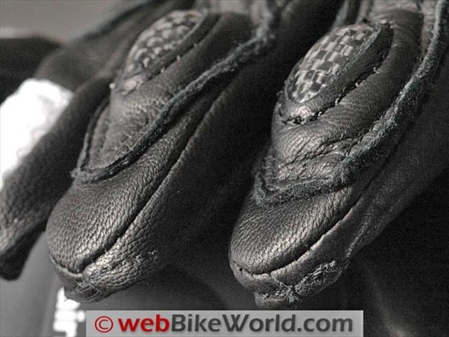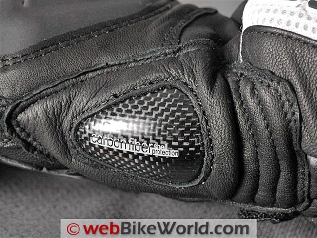 The outer edge of the heel of each hand of the Indianapolis gloves feature a carbon fiber slider attached to a separate section of leather than also covers the outside of the wrist. Carbon fiber is also used for middle and first knuckle protectors on the forefinger and second finger and on the middle knuckle of the third finger. The tip of the third finger and the entire fourth (pinky) finger is unprotected other than with the leather and/or mesh.