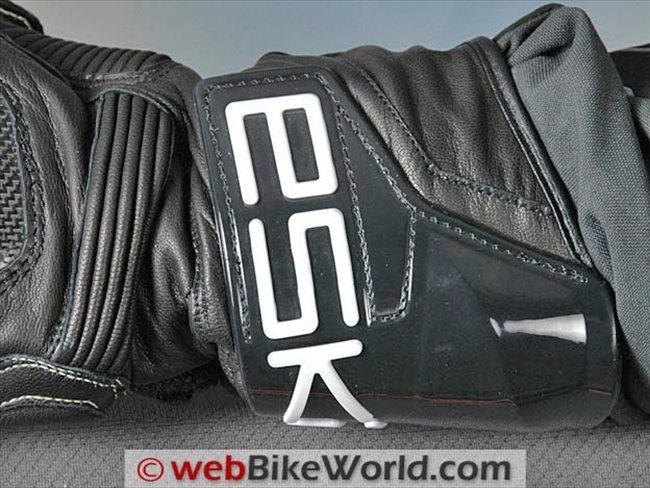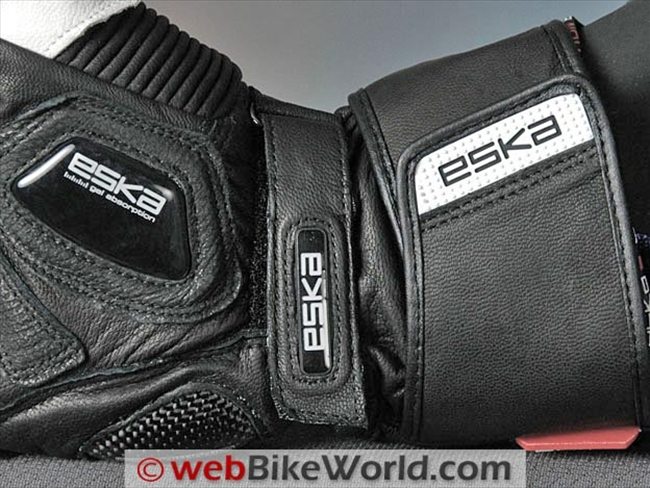 The Indianapolis gloves secure on the hands with the Eska Race glove dual attachment system at the wrist. On these gloves, the TPU plastic gauntlet cover is replaced by a simple leather strap that seems slightly smaller than might be desirable for best protection.