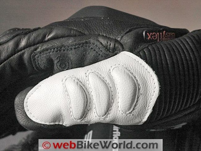 This section is also backed with a separate piece of semi-shiny leather to allow it to slide more easily over the thumb as it bends. There are three small kidney-shaped protective pads sewn into the top of this to protect the thumb. The Easy Flex design includes leather accordion pleats and the semi-floating thumb protector, both of which add to the flexibility of the leather and to provide pressure relief for the thumb.