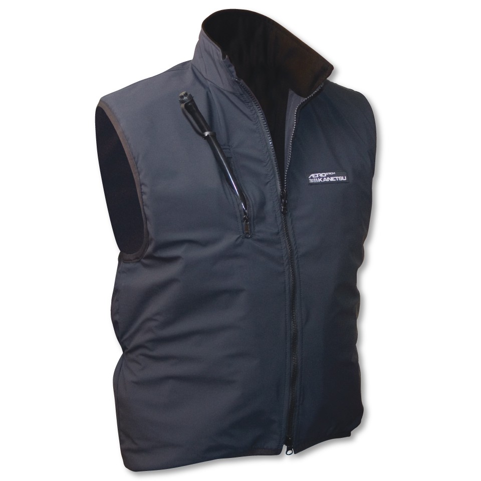 There are other thermal vests on the market which use air as an insulator like the Aerostich Airvantage. It sells for $247 USD. It has built-in electric elements to combine with the air insulation, so it probably works really well but it has a zipper running up the center.