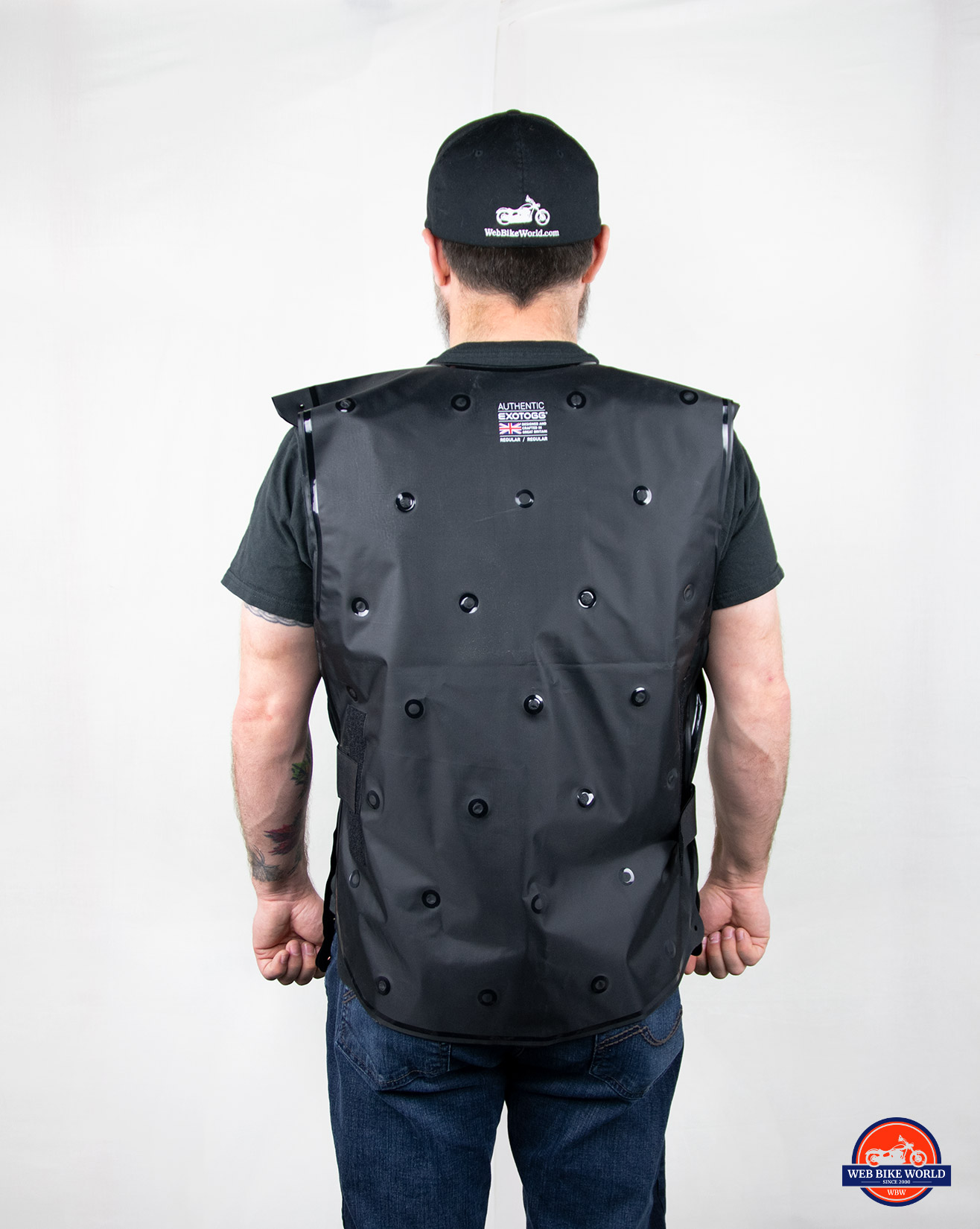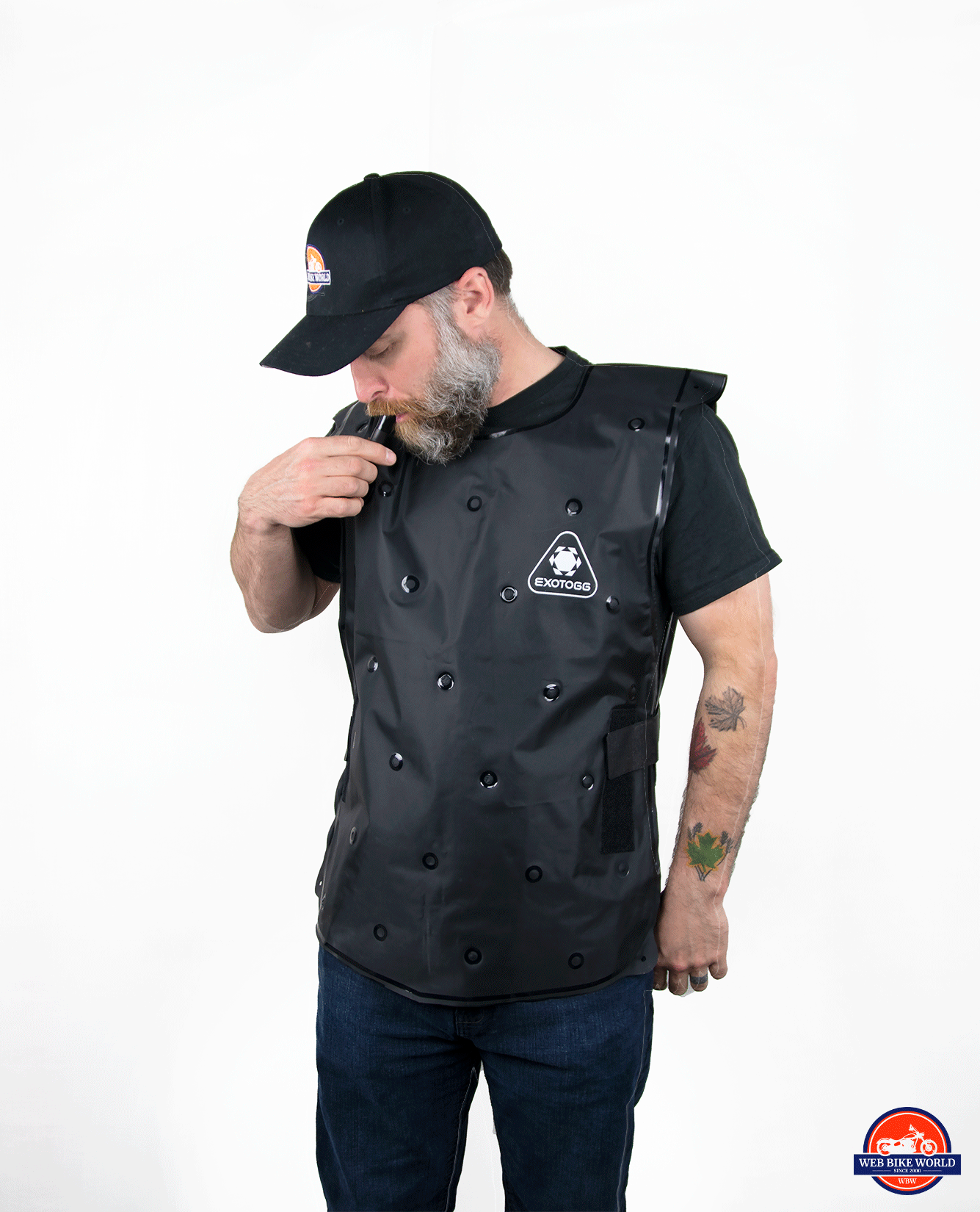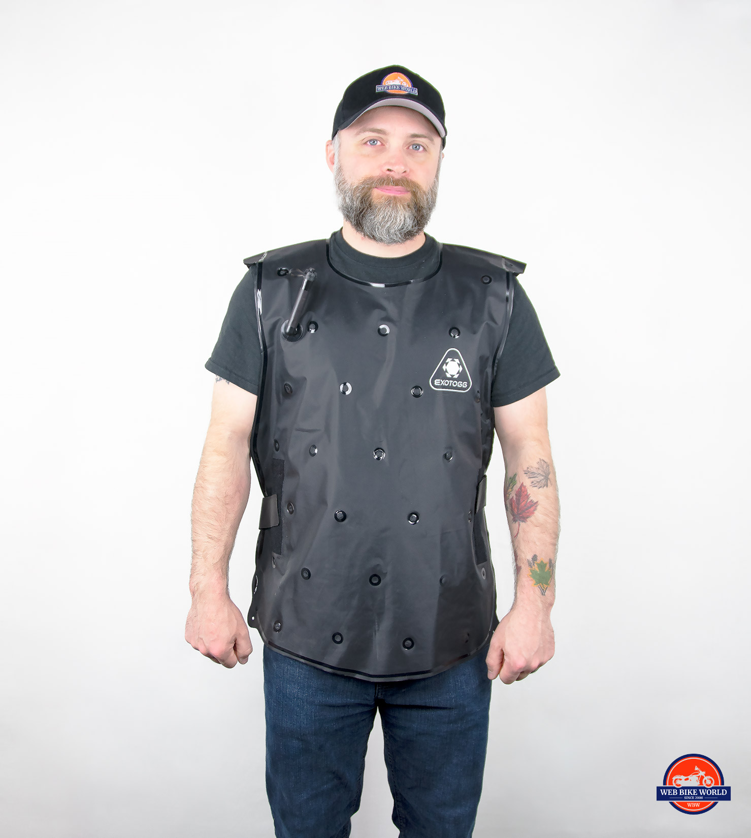 The Exotogg feels better under a non-motorcycle jacket that fits more loosely. That allows you to feel unencumbered by air being forced from the tight-fitting waist area up to gather around your chest, neck, and shoulders.