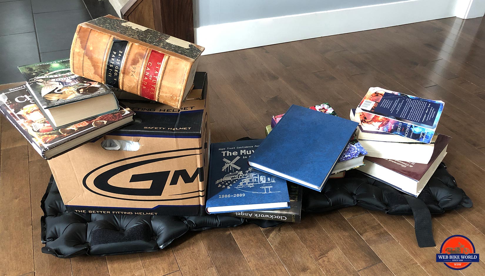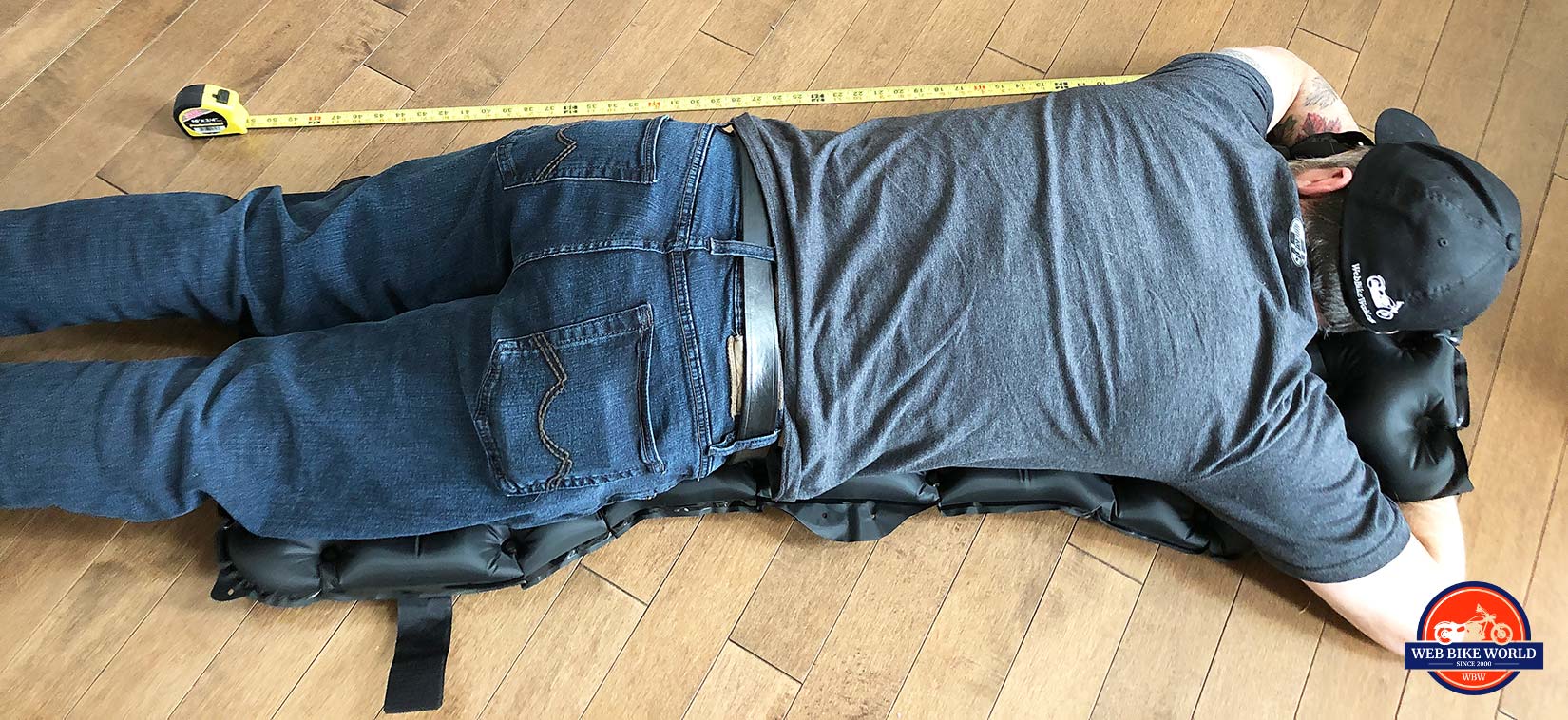 The Exotogg laid out flat and fully inflated is about 4 feet long. As you can see someone my height (5’7”) can easily fit on it and use it as a bedroll. Instead of actually sleeping on it what I did was place a ton of heavy books on top of it in my living room and I checked to see how well it held air over an 8 hour period.