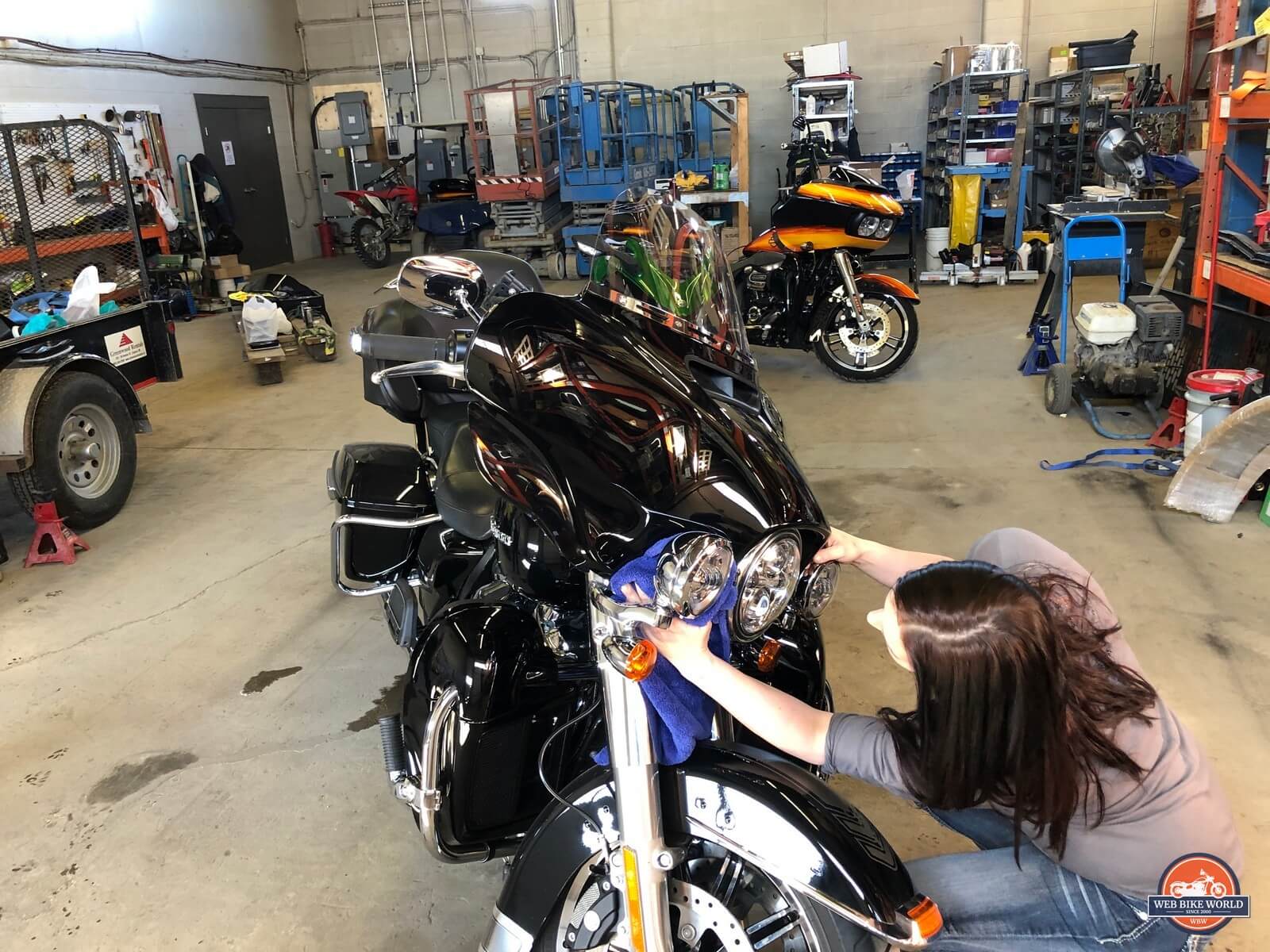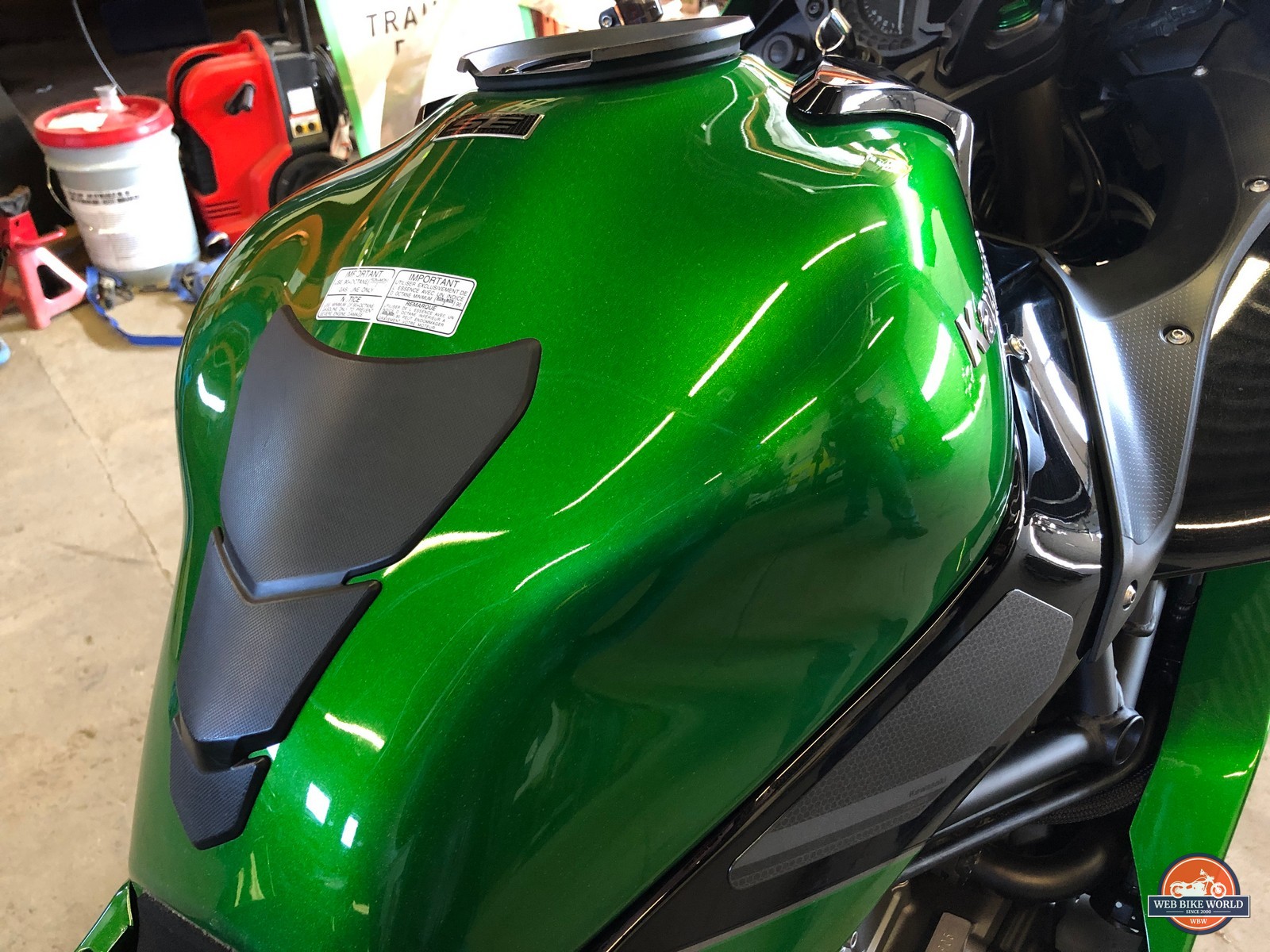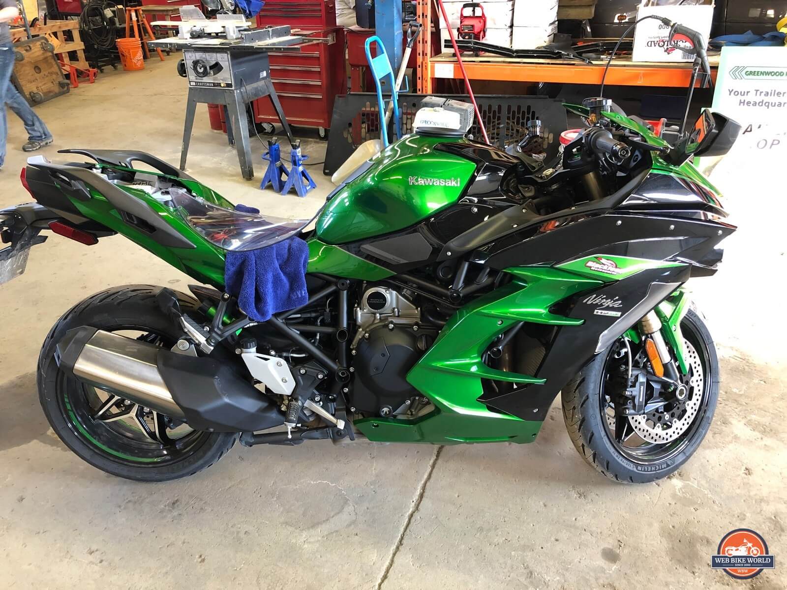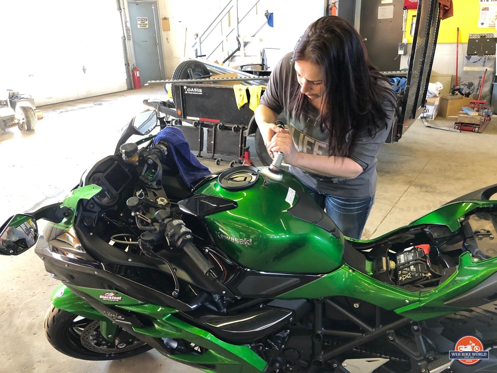 Kate set to work immediately and spent over 12 hours of hard manual labor lovingly buffing out every scratch, blemish, and imperfection to be found on my H2SX SE. This bike has been through a lot of rough treatment if you recall.