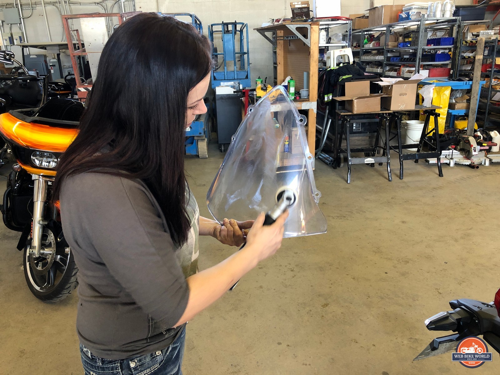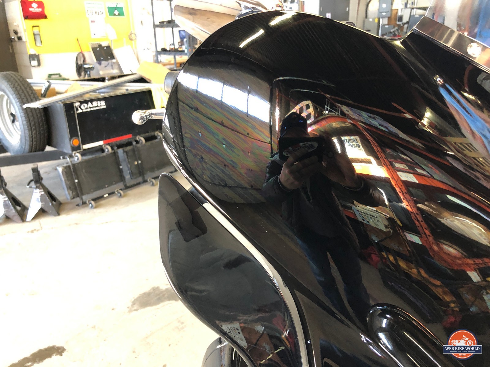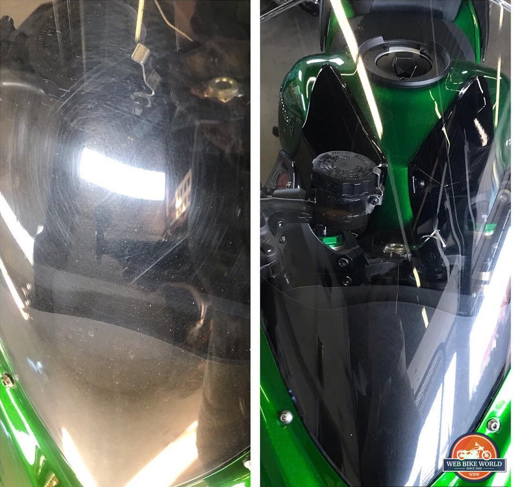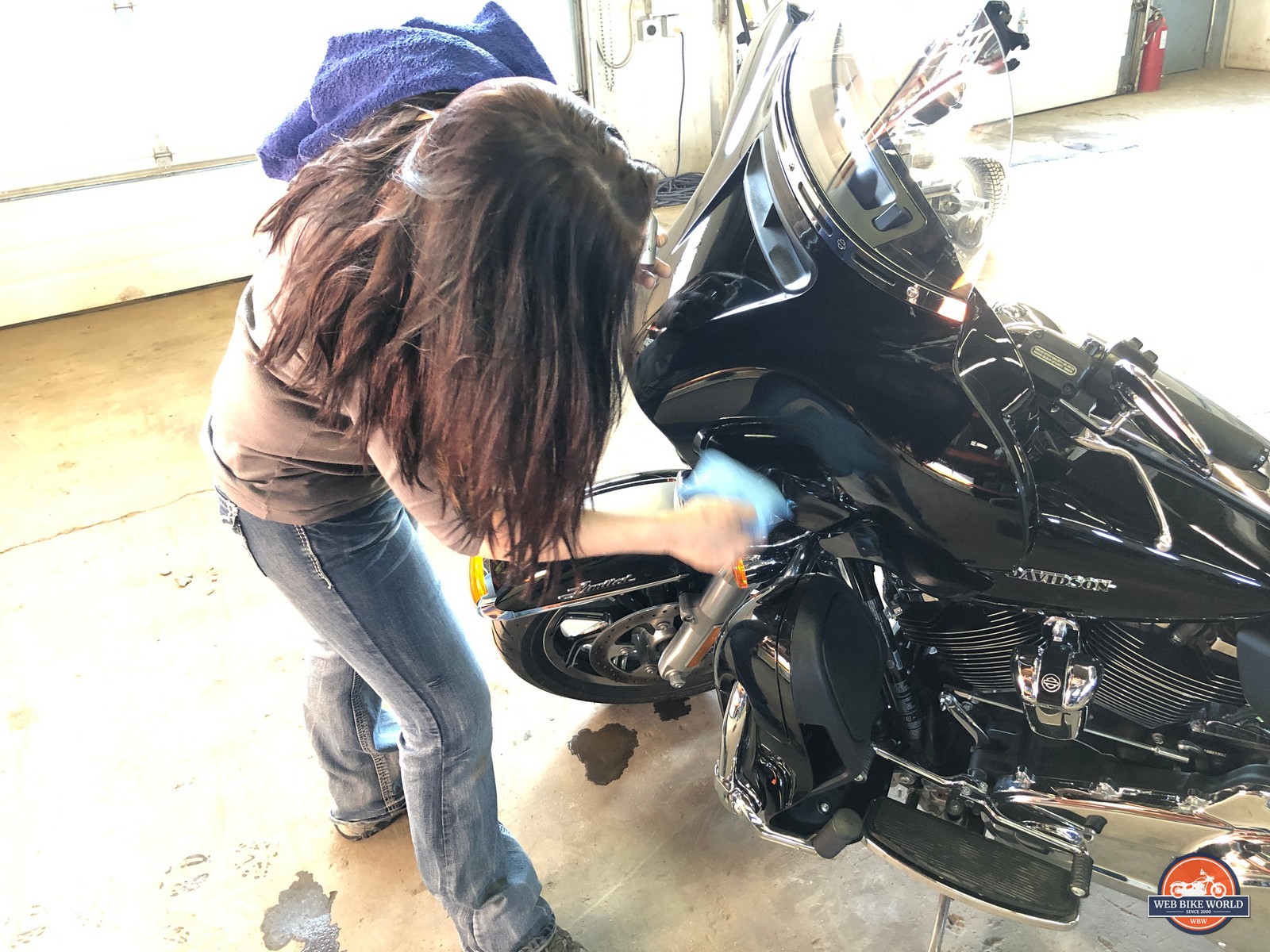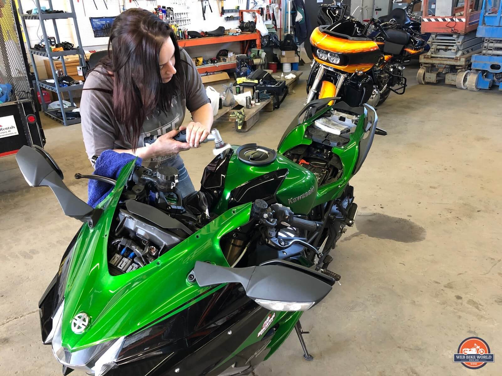 Kate set to work immediately and spent over 12 hours of hard manual labor lovingly buffing out every scratch, blemish, and imperfection to be found on my H2SX SE. This bike has been through a lot of rough treatment if you recall.