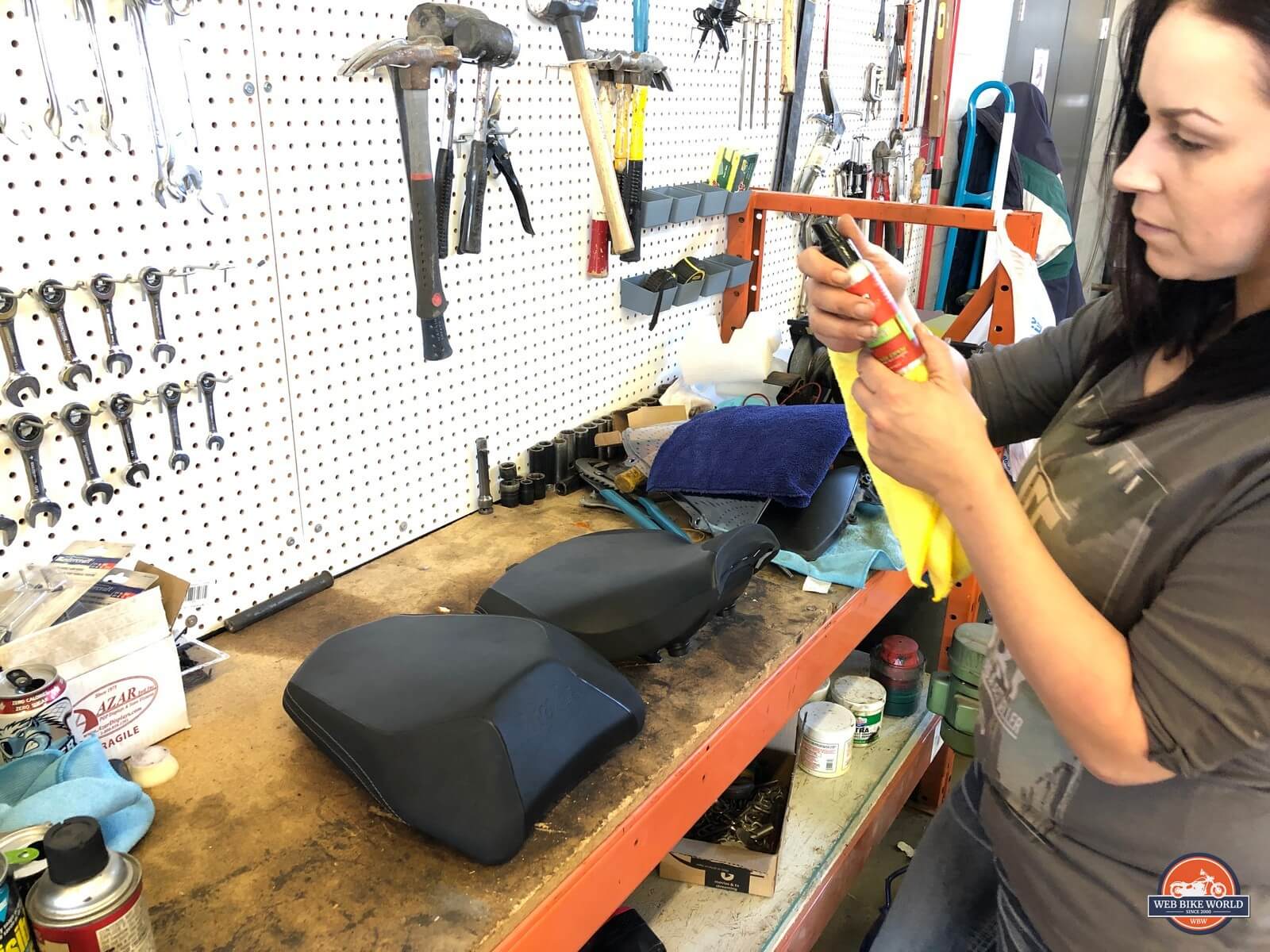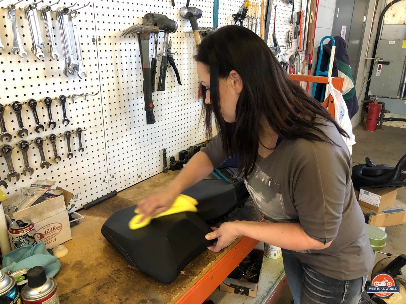 As mentioned before two spots that line up with my “cheeks” did rub through the coating on my seat, but it’s not noticeable until the bike is completely wet. Feynlab installers like Kate will always be happy to touch up something like that anyway if you want. I’m not worried about that part since I tend to apply leather protectant regularly anyway.