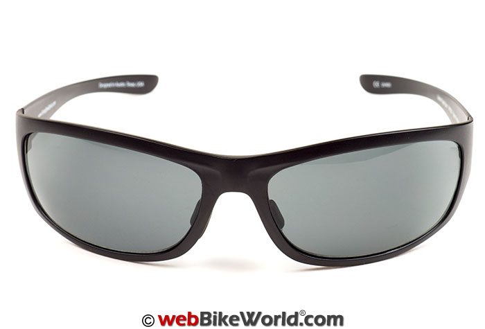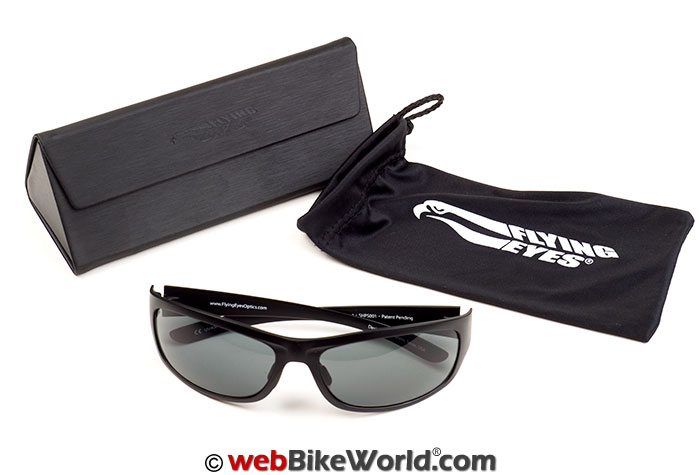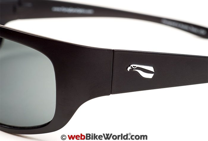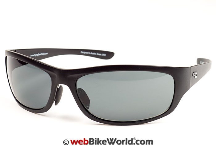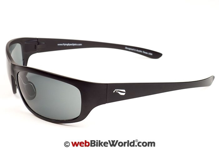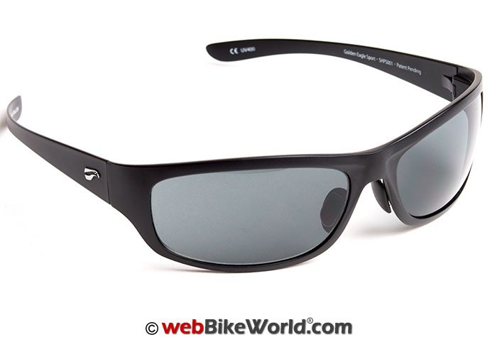 The Golden Eagle Sport sunglasses are one of several designs available from Flying Eyes and they have a contemporary, semi-wraparound look. The pair I received has a matte black finish to the frames and a solid (non-graduated) gray tint.