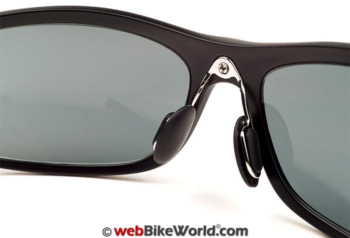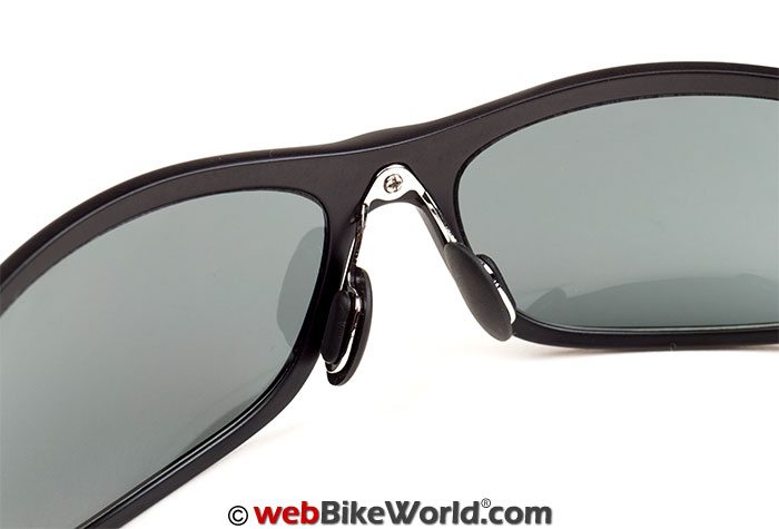 Attached to the frame is a small metal strut assembly on which the nose pads sit. This allows for the pads to adjusted by gently bending the struts to the correct position for best fit. I asked Flying Eyes support if this part is available for purchase by itself (in case one breaks it).