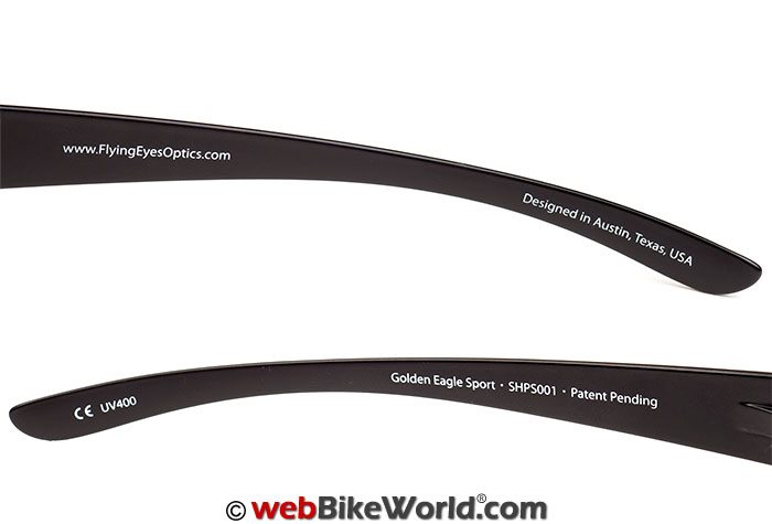 Branding is nice and subtle with only the Flying Eyes “raptor” logo embossed in silver just behind the hinges of the temples on each side. On the interior facing side of each temple “arm” is the brand’s website information, model details, UV rating, and a “Designed in Austin, TX USA” callout.