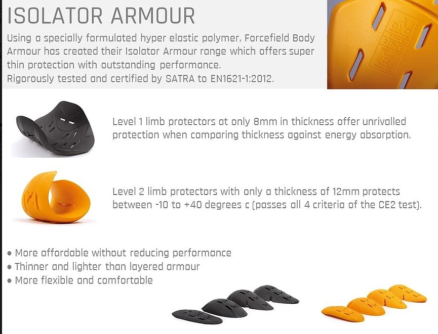 It definitely absorbs energy effectively. I jumped up and landed right on the knee pads with my full body weight and elbowed the corners of walls without feeling pain or taking any body damage. It protects just as well as the Rukka D30 and Motoport USA Quad armour systems I’m familiar with from what I can tell after slamming my limbs into hard objects around the house.