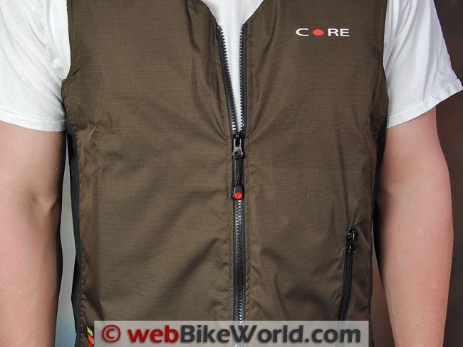 The Gerbing Core Heat Vest Liner has an unbranded nylon-tooth zipper in the front with the runner located on the left side. The zipper and the other seams use single- and double-row stitching.