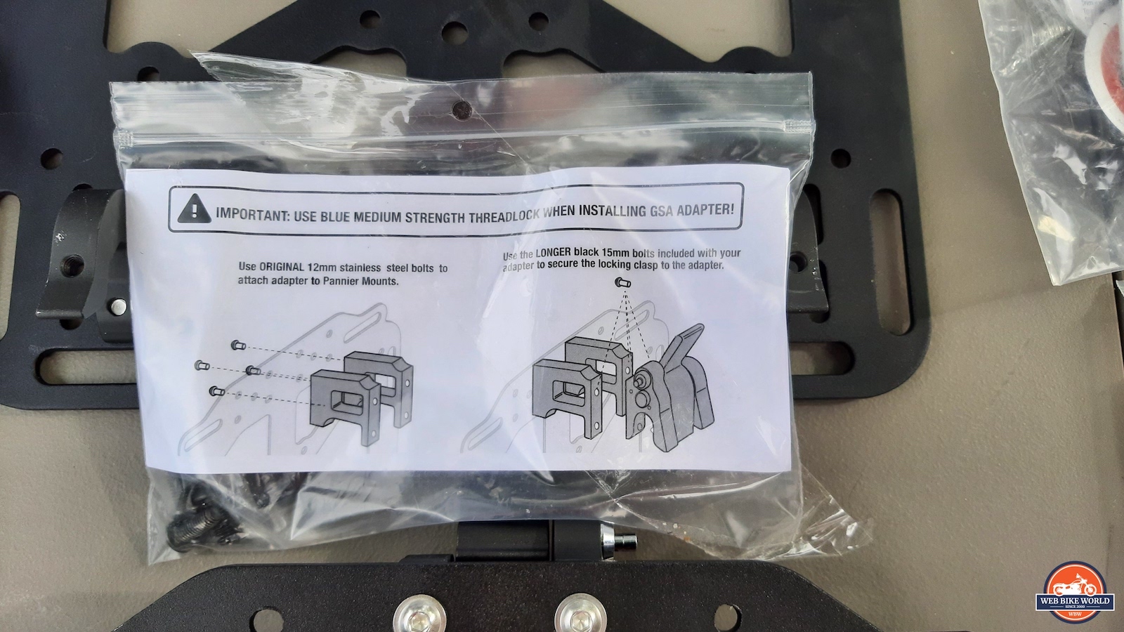 The lower mounting pieces (hooks) were not set for use with the GS ADV frames either, but neither posed an issue – the right plate needed to have the GS ADV adapter mounted anyway, and all the hardware needed treatment with the thread locking compound upon assembly or reassembly as the case might be; this is a good learning experience.