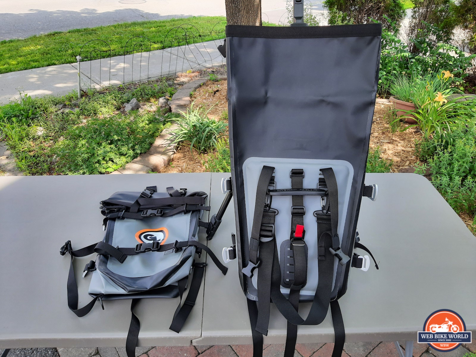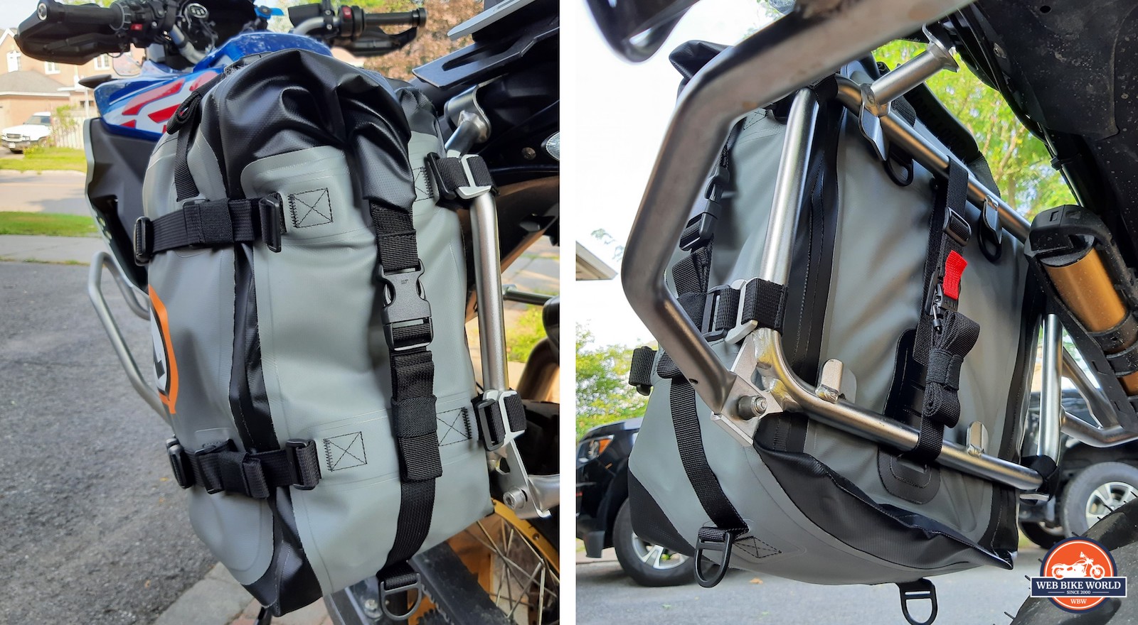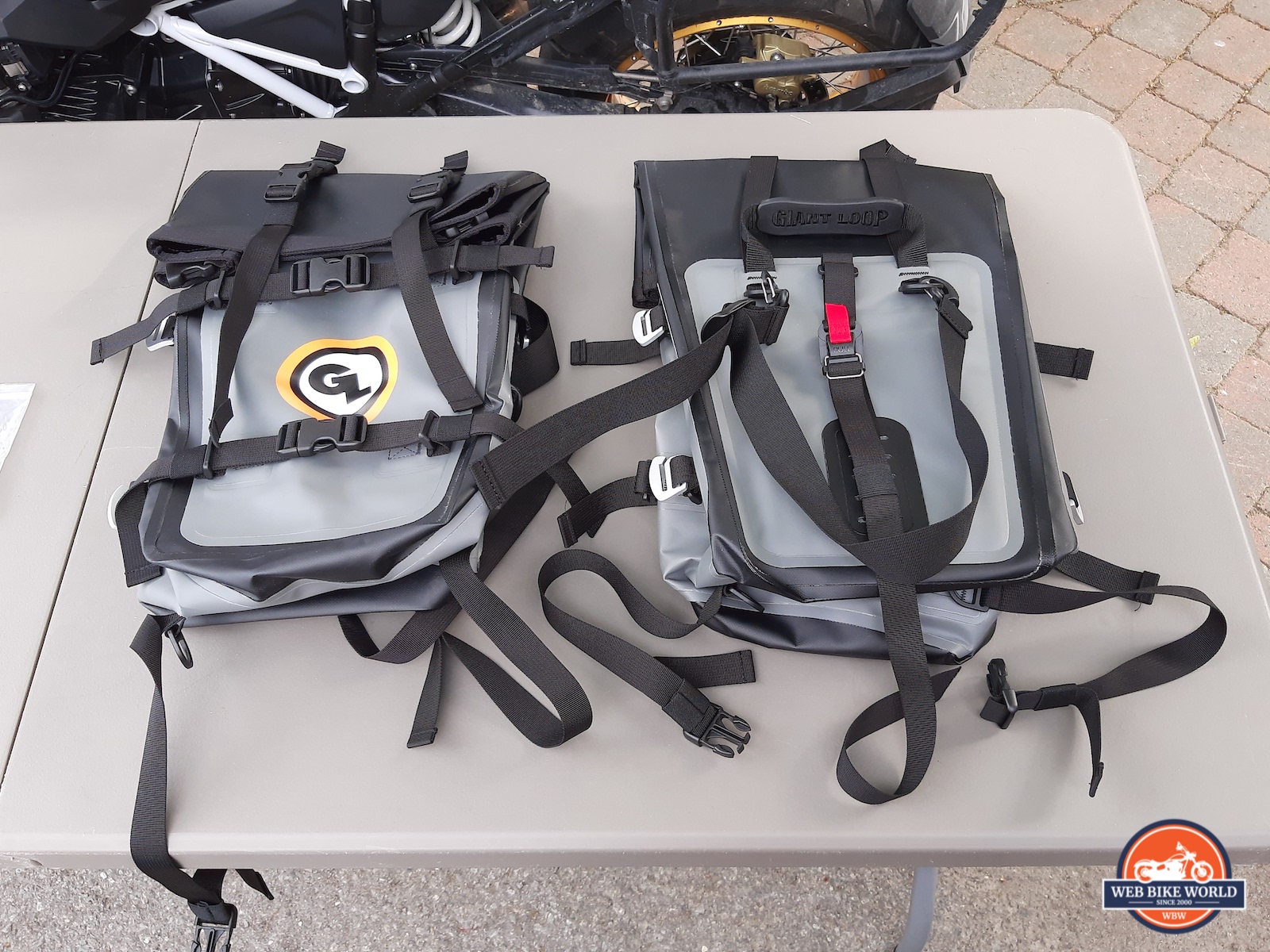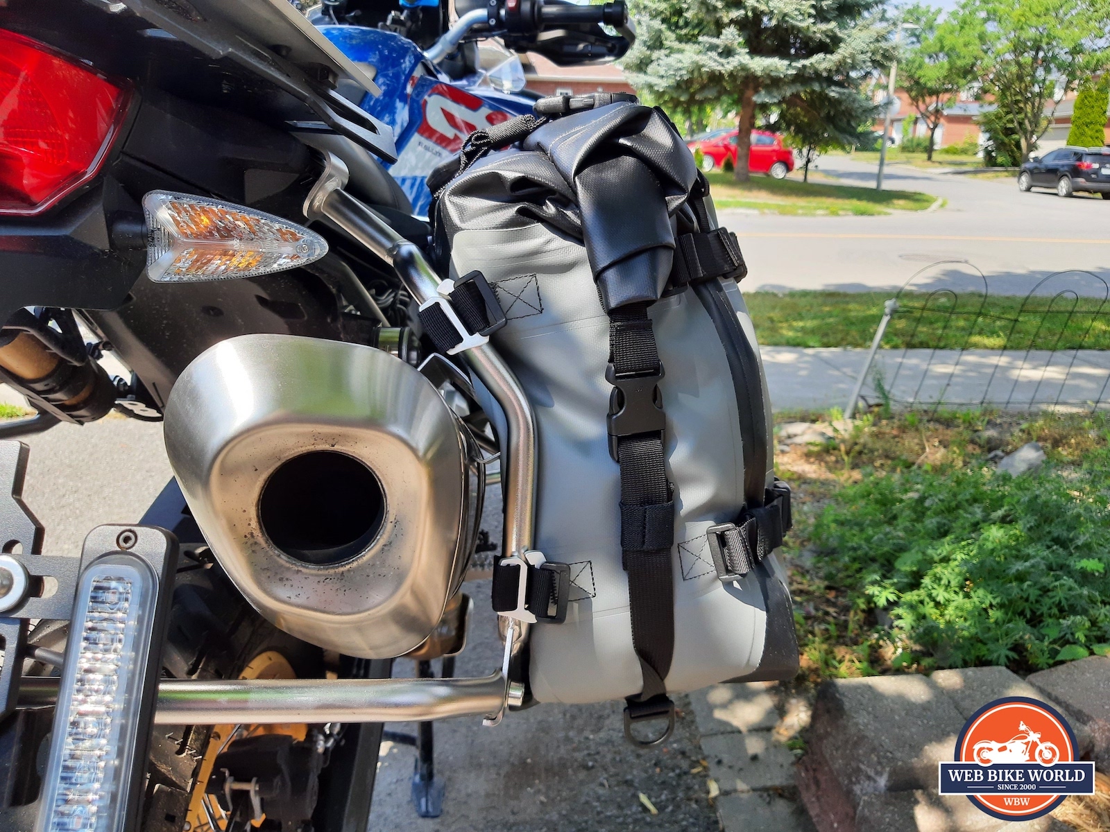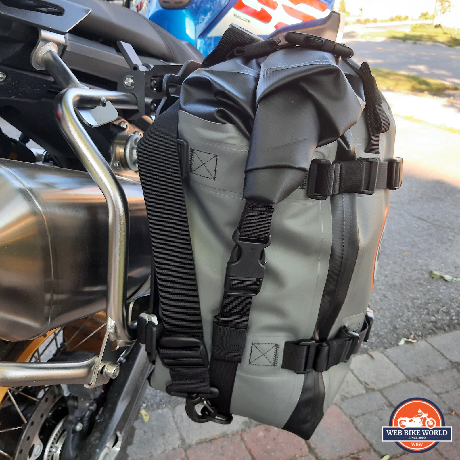 The GL MotoTrekk Panniers are, in reality, cleverly disguised roll-top drybags! Gadzooks! What a revelation. In other words, anything put inside these pieces, with or without using smaller packing bags or stuff sacks for organization, is going to stay absolutely positively secure and dry, as long as a minimum of three rolls is made and the side and top straps tightly secured.