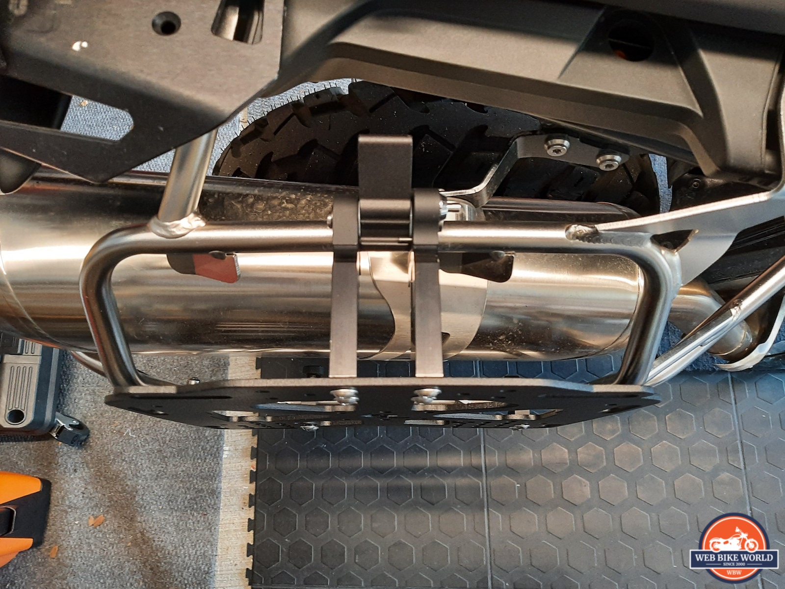 The default positioning of the Pannier Mounts and the attached MotoTrekk Panniers is a good compromise regarding height and vertical clearances. But if more or less clearance is needed or desired between parts and/or the ground, some height adjustment is possible although it isn’t as much as might be desired (see Observation below).