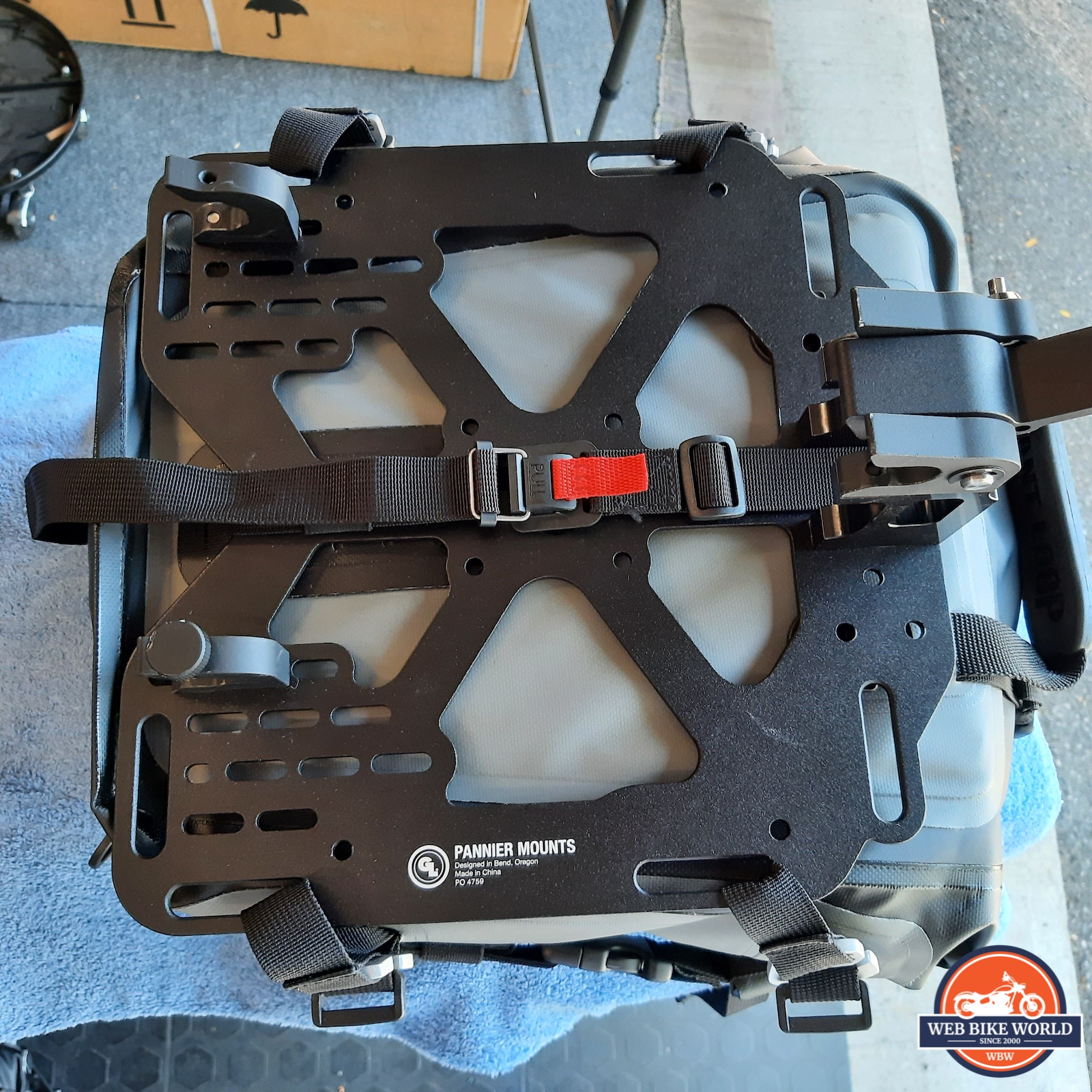 For mounting the panniers directly to motorcycle luggage frames or when using the GL Pannier Mounts an adjustable anchor strap on the back of the pannier can be routed behind the frames, adjusted, and secured using its magnetic quick-release clasp to keep the empty or full panniers in place on the frames while the corner mounting points are tackled.