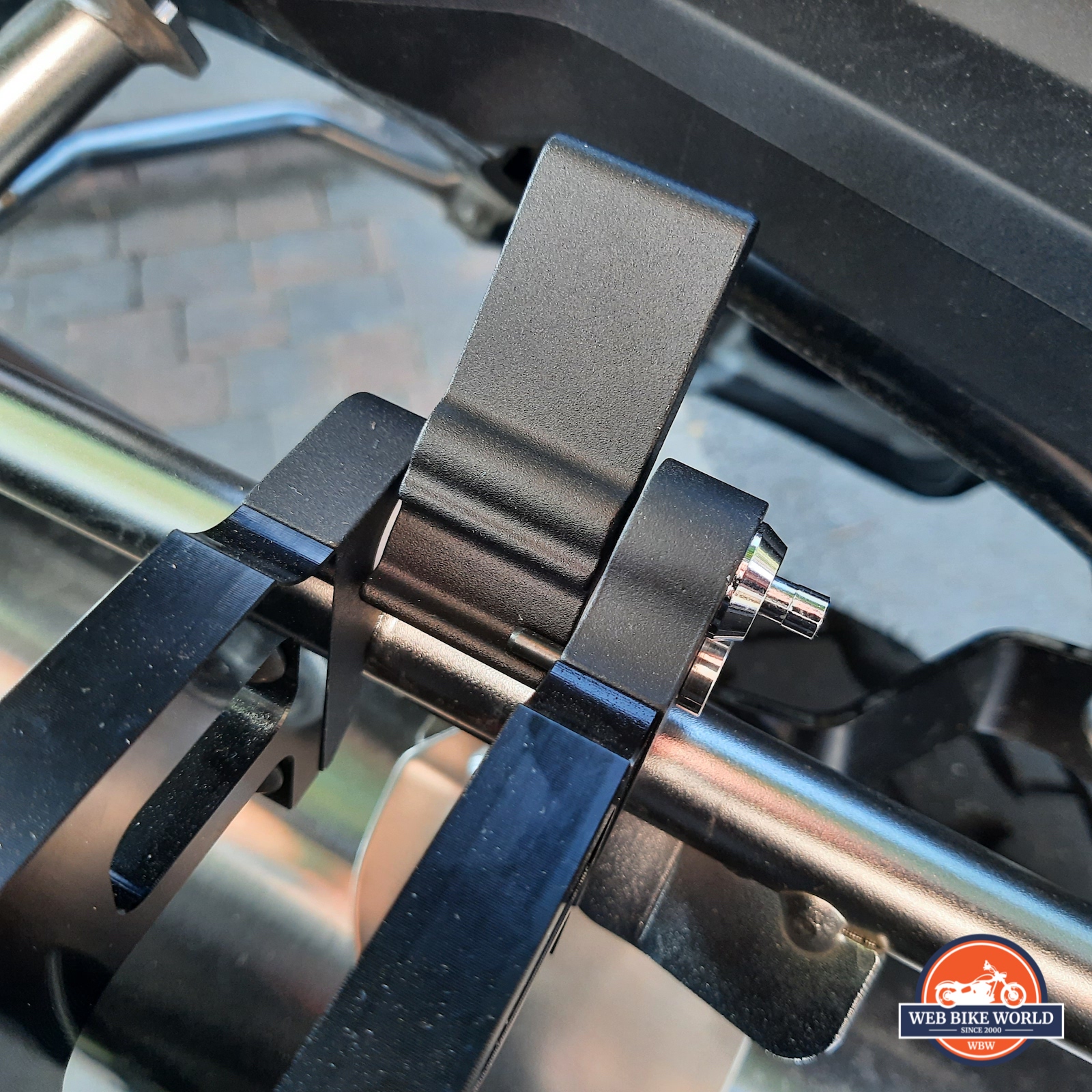 As identified earlier, another unique and most appreciated feature of the GL Pannier Mounts is the small pin-style lock incorporated into the quick connect latch engagement component. With the pannier mount fitted, the quick connect clasp fully engaged around the upper tubing, and the locking pin pushed in the mount is now secured.