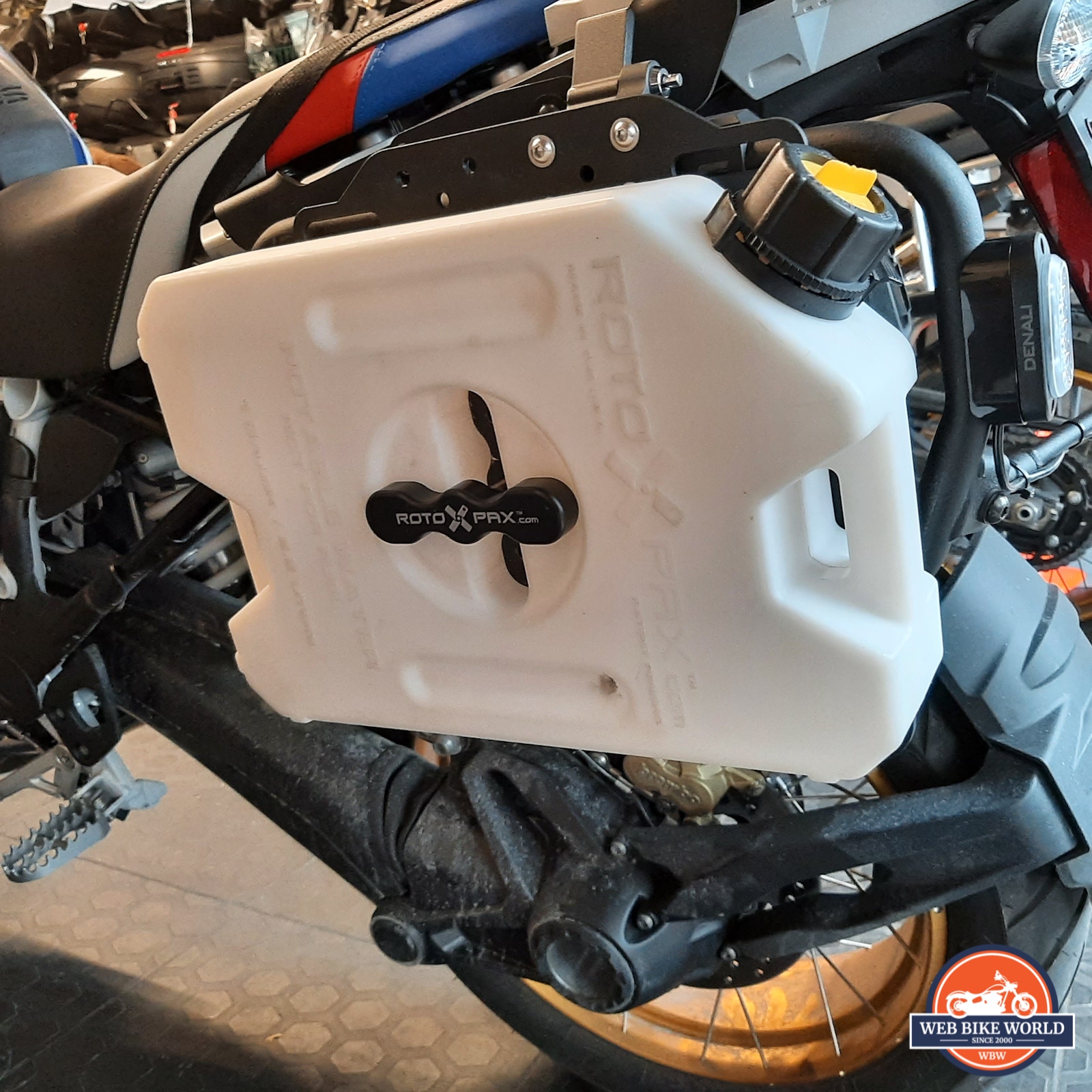 The center or hub of the mounts (plates) is pre-drilled for RotopaX (with or without the base plate) or similarly mounted systems. For the R 1250 GS and the F 850 GSA this provides the means to carry a fuel or water container on the left (non-exhaust) side without clearance issues.